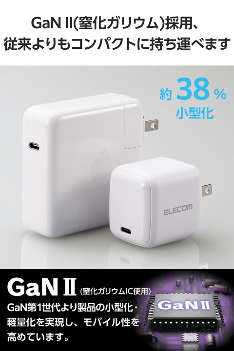 スマートフォンもノートパソコンもこれ1台で充電OK!USB Type-C(TM)ポートを1ポート搭載し、幅広い機器に充電できる、USB Power Delivery対応の高出力65W USB AC充電器です。コンパクトでビジネスでの外出やリモートワーク、出張、旅行など持ち運びにも便利です。![]() ■ノートパソコンからスマートフォンまでこれ1台で充電できる、高出力のUSB AC充電器です。デバイスごとに専用の充電器を持ち運ぶ必要はありません。 ■※USB Power Delivery規格で65Wまで充電できる機器に限ります。 ■ノートパソコン付属のACアダプターと違い必要な長さのケーブルを選んで使えるから、長すぎるケーブルでごちゃつきがちなデスク周りもこれですっきり。スペースを広々使えます。 ■GaN II(窒化ガリウム)を採用し、高出力ながらコンパクトサイズを実現。プラグ部分も折り畳むことができるため、バッグの中でもスペースを取らず、ビジネスでの外出やリモートワーク、出張、旅行など持ち運びにも便利です。 ■※GaN II(窒化ガリウム)はGaN第1世代より、製品の小型化および軽量化を実現することで、よりモバイル性を高めています。 ■USB Power Delivery、PPS(Programmable Power Supply)に対応しています。iPhoneを約30分で50%まで充電できるから、外出先でスピード充電が可能です。 ■※USB Power Deliveryとは、アダプターと接続機器間で情報をやり取りすることで、その機器間における最適な電力を選択し、高速充電を実現するUSB規格です。PPS(Programmable Power Supply)とは、0.2V単位で電圧を調整し、最適な電力で効率的に供給することができるUSB Power Delivery のオプション規格です。 ■※本製品のUSB Power Delivery最大出力は65Wです。PPS(Programmable Power Supply)最大出力は65Wです。 ■USB Power DeliveryおよびPPS(Programmable Power Supply)に対応したUSB Type-Cポートを搭載し、機器に応じて出力が5V/3A、9V/3A、12V/3A、15V/3A、20V/3.25Aと可変し、iPhoneなどのスマートフォンから、iPadなどのタブレット、MacBookや高性能なWindowsノートパソコンまで幅広く高速充電できます。 ■本製品はUSB-IFのテストと同等のテストを当社独自で実施し、高い安全性が保たれているため、USB Power Delivery対応製品にご使用いただけます。 ■耐トラッキング性の要求事項(PSE:電気用品安全法)を満たしたコンセントプラグを採用しています。 ■※本製品にケーブルは同梱しておりません。別途USBケーブルなどをご用意ください。 ■※65Wでの充電を行う場合は、100W以上の充電に対応したUSBケーブルをご用意ください。 ■※USB Type-C and USB-C are trademarks of USB Implementers Forum ■自社環境認定基準を1つ以上満たし、『THINK ECOLOGY』マークを表示した製品です。 ■廃棄物削減に取り組み、製品に同梱する取扱説明書等をペーパーレス化した製品です。 ■環境保全に取り組み、製品の包装容器におけるプラスチック重量を、社内基準製品より20%以上削減した製品です。 ■環境保全に取り組み、製品の包装容器が紙・ダンボール・ポリ袋のみで構成されている製品です。 ![]() ■対応機種:USB Type-C(TM)ポートからUSB Power Delivery (65W)およびオプション規格であるPPS(Programmable Power Supply)の規格内で充電可能な端末 ■定格入力電圧:AC100V〜240V、50Hz/60Hz ■定格入力電流:1.8A ■定格出力電力:最大出力65W、PPS最大出力65W ■定格出力電圧:5V/9V/12V/15V/20V、PPS出力5V〜16V/5V〜21V ■定格出力電流:5V時3A/9V時3A/12V時3A/15V時3A/20V時3.25A、PPS出力5V〜16V時3A、5V〜21V時3.25A ■外形寸法:幅約45.2mm×奥行約38.1mm×高さ約43.8mm ■重量:約98g ■カラー:ホワイト ■使用可能地域:日本 ■保証期間:1年間 ■コネクター形状:USB Type-Cポート×1 ■コンセントプラグ仕様:90度スイング構造 ■使用温度範囲:-10℃〜25℃ ■法令:◇PSE 特定電気用品 |