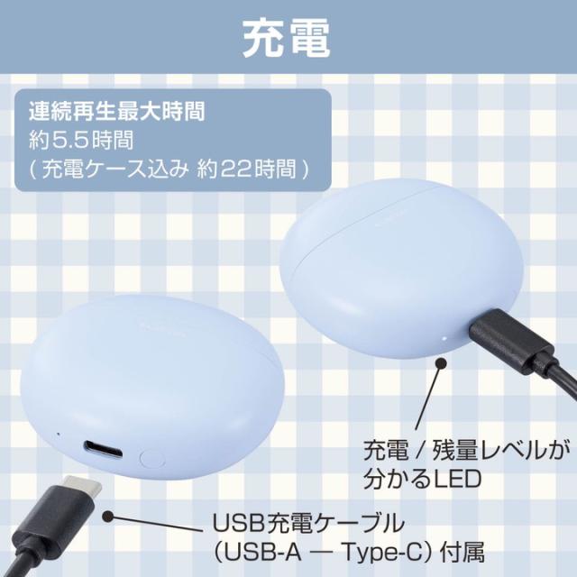 装着時も収納時もコンパクトなBluetooth(R)完全ワイヤレスステレオヘッドホン。耳への負担が少なく、周囲の音や話し声が聞き取りやすいセミオープンタイプです。充電ケースはマカロンのようなコロンとした形で、ファッションのワンポイントにもなるカラーバリエーションが特長です。![]() ■装着時も収納時もコンパクトな、セミオープンタイプのBluetooth(R)完全ワイヤレスステレオヘッドホンです。 ■充電ケースはマカロンのようなまるくてコロンとした形がポイントです。ファッションのワンポイントにもなる、やわらかながら存在感のある「ピンク」「ブルー」「グリーン」「イエロー」をラインアップしています。 ■手のひらに収まるサイズの充電ケースは、約22mmの薄さ。小さなバッグや服のポケットに入れてもシルエットが崩れず、スマートに持ち運べます。 ■ヘッドホンは耳への負担を軽減し、周囲の音や話し声が聞き取りやすいセミオープンタイプです。耳への圧迫感が少なく、耳せんタイプが苦手な方にもおすすめです。 ■耳の形状に合わせたエルゴノミクスデザインによるフィット感と、片側わずか約3.3gの超軽量設計で、快適な装着感を実現しました。 ■高音質コーデックAACに対応し、iPhoneをはじめとしたAAC対応スマートフォンや音楽プレーヤーで、クリアなサウンドを体感できます。 ■φ14.2mmの外磁型ダイナミックドライバー・Micro ETEM Driver(ELECOM Torus External Magnet Driver)を採用し、小型ながら力強く、ワイドレンジでクリアな音質を実現します。 ■低遅延モードは、Bluetooth(R)特有の映像と音の遅延を軽減し、ストレスなく動画視聴やゲームを楽しめます。 ■ヘッドホンは出っ張りが少ないため、耳への掛かりが良い形状です。マスクや髪に引っかかりにくく、スマートに装着できます。 ■タッチセンサーの採用により耳元での操作がスムーズかつショックレスで、ヘッドホンが耳からずれにくいです。 ■音楽・動画の再生中や通話中などに、音量の調節をヘッドホンのタッチセンサーで手軽に行えます。 ■左右のヘッドホンが完全に独立しているためクロストークがなく、リアルなステレオイメージを再現します。 ■ヘッドホンは片側のみでも使用が可能です。 ■※使用していない片側のヘッドホンは、電源を切るか充電ケースに収納してください。 ■初期登録後は、充電ケースから取り出すだけでスマートフォンなどの機器と自動でペアリングします。 ■スマートフォンやタブレットだけでなく、パソコンなどのBluetooth(R)対応機器への接続も可能なため、テレワークにもお使いいただけます。 ■音楽を楽しむだけでなく、通話もできるマイクが内蔵されています。 ■Siriや Google アシスタント などの音声AIに対応し、ヘッドホンのタッチセンサーで簡単にスマートフォンなどの音声アシスタントが呼び出せます。音声操作で音楽をかけたり、音量調節をしたりすることが可能です。 ■※通話・音声AIは左右ヘッドホンのどちらか片方のマイクが有効になります。 ■ヘッドホンは1回の充電で約5.5時間の連続音楽再生が可能です。 ■充電ケースにはバッテリーを搭載し、ヘッドホンへの充電が可能です。トータルで最大約22時間の使用が可能です。 ■過充電保護と過放電保護を備えたリチウムイオン電池により、繰り返し充電して使用できます。 ■充電ケース内蔵のバッテリー状態がわかるように、バッテリーインジケーターを搭載しています。LEDの点滅状態で充電/残量レベルを把握できます。 ■スマートフォンとの接続時、スマートフォン画面でヘッドホンのバッテリー残量を確認できます。 ■充電ケースにはUSB Type-C(TM)ポートを搭載し、iPhone 15シリーズやAndroidなどのスマートフォンと同じケーブルで充電が可能です。 ■飾ってもかわいいフェイクブック風のパッケージです。お部屋のちょっとしたアクセントにもぴったり。 ■※USB Type-C and USB-C are trademarks of USB Implementers Forum ■自社環境認定基準を1つ以上満たし、『THINKECOLOGY』マークを表示した製品です。 ■環境保全に取り組み、製品の包装容器におけるプラスチック重量を、社内基準製品より20%以上削減した製品です。 ■環境保全に取り組み、製品の包装容器が紙・ダンボール・ポリ袋のみで構成されている製品です。 ![]() ■通信方式:Bluetooth標準規格 Version5.3 ■出力:Bluetooth Power Class2 ■最大通信距離:約10m ※障害物なきこと ■使用周波数帯域:2.4GHz帯 ■変調方式:FHSS(周波数ホッピング方式スペクトラム拡散) ■対応Bluetoothプロファイル:A2DP、AVRCP、HFP ■A2DPの対応コーデック:SBC、AAC ■A2DPの対応コンテンツ保護:○:SCMS-T ■最大登録可能台数:8台 ■マルチポイント(同時待ち受け):非対応 ■再生周波数帯域(A2DP):20-20,000Hz ■連続再生最大時間:約5.5時間(充電ケース込み 約22時間) ■連続待受最大時間:最大約40時間 ■電源:充電式リチウムイオン電池 ■定格電圧:DC5V ■充電時間:ヘッドホン:約1.5時間、充電ケース:約2時間 ■マイク型式:MEMS型 ■外形寸法:ヘッドホン