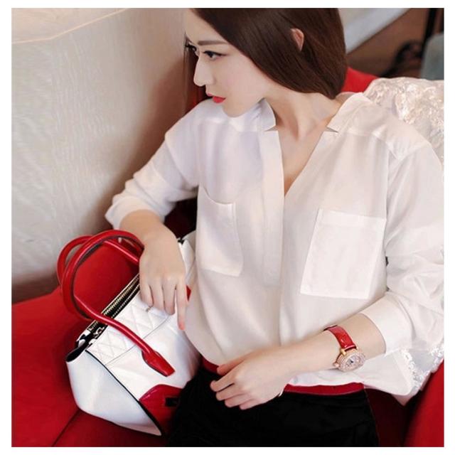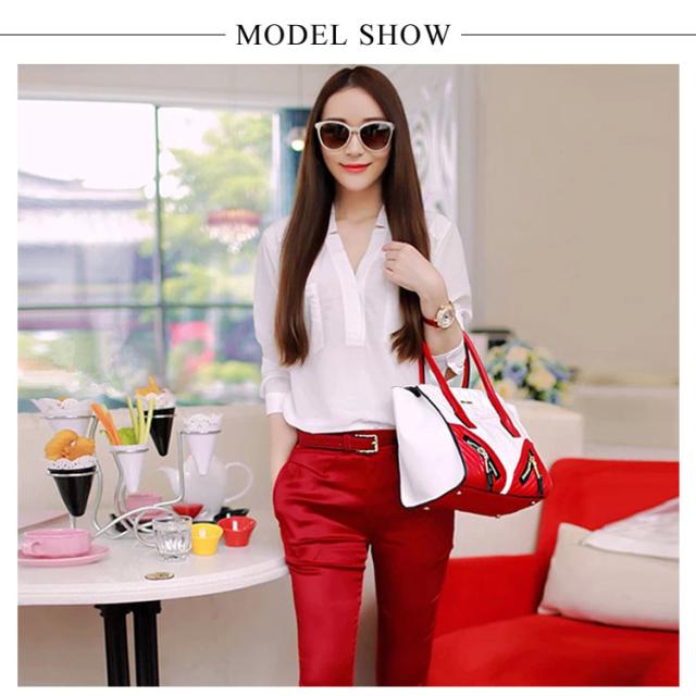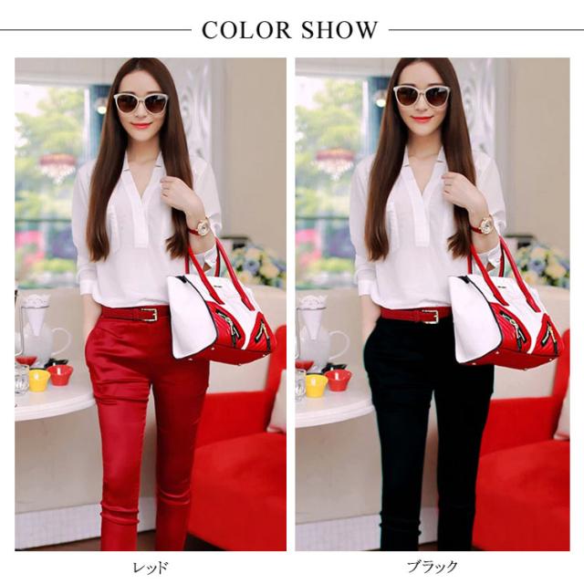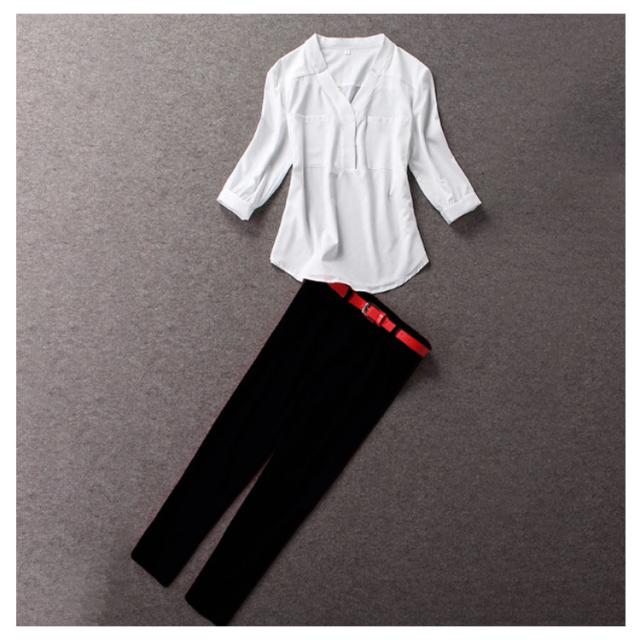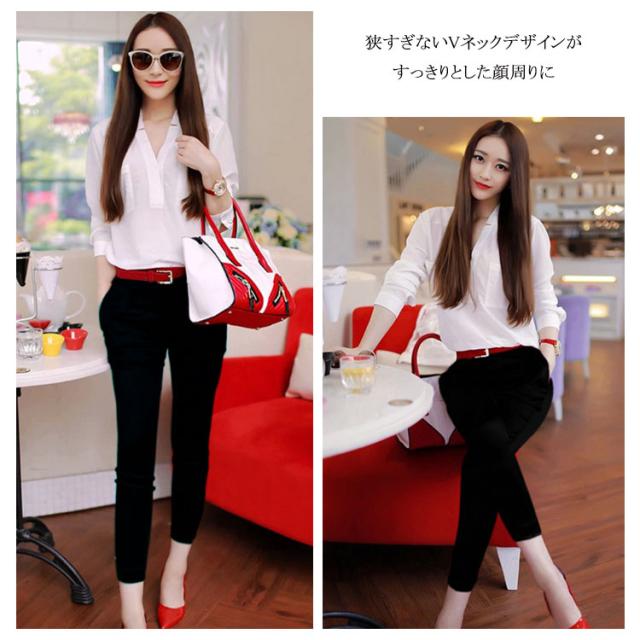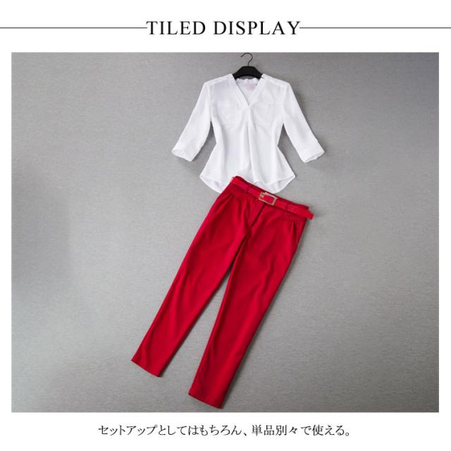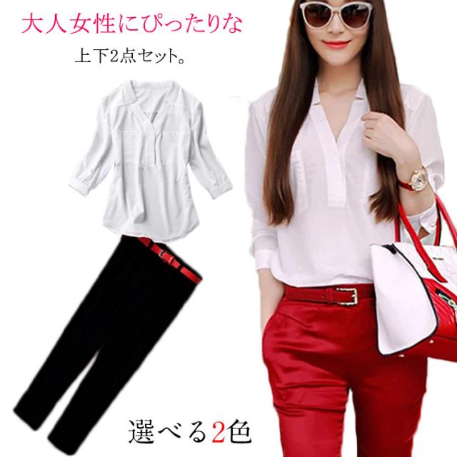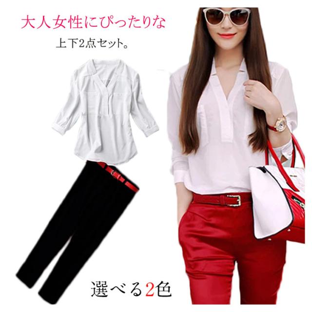 夏物 2点セット レディース 上下セット セットアップ 七分袖ブラウス シフォンシャツ 9分パンツ Vネック OL 無地 スリム 着痩せ 春 夏送料無料
