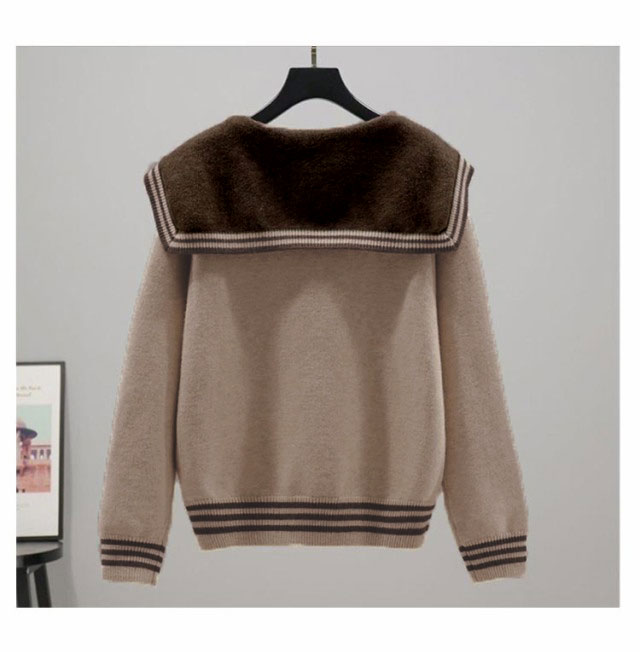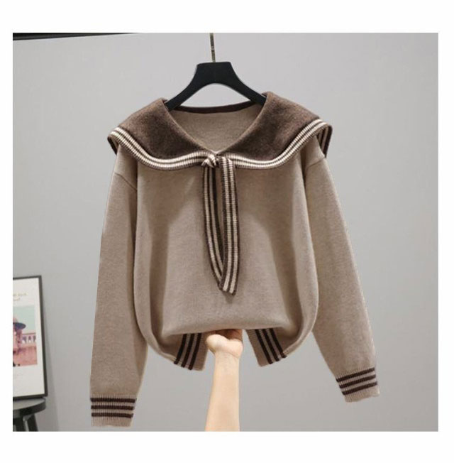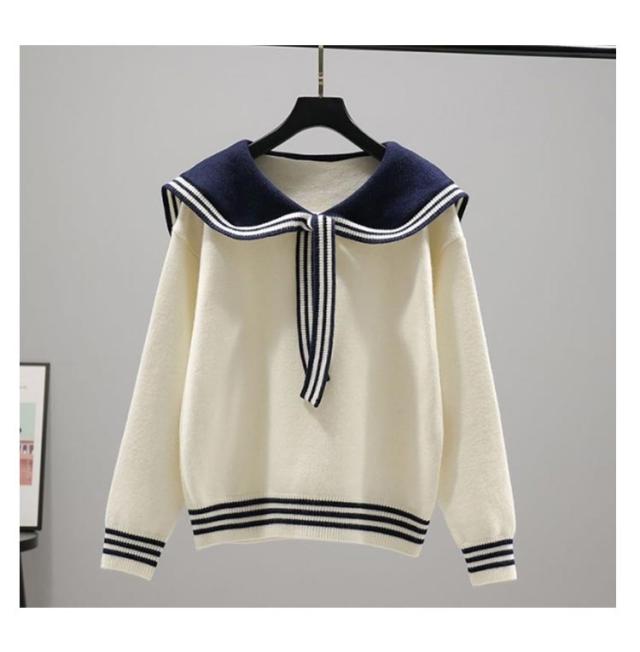 | 配色ラインがアクセント♪ 大きめのセーラーカラーニットセーター。 セーラーカラーが目を惹くデザインは1枚でコーデの主役に◎ 柔らかな肌触りで着心地良く、一枚トップスとしてもアウターのインナーとしても使える。 | |