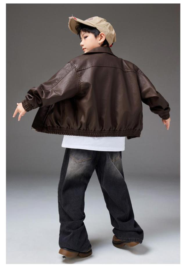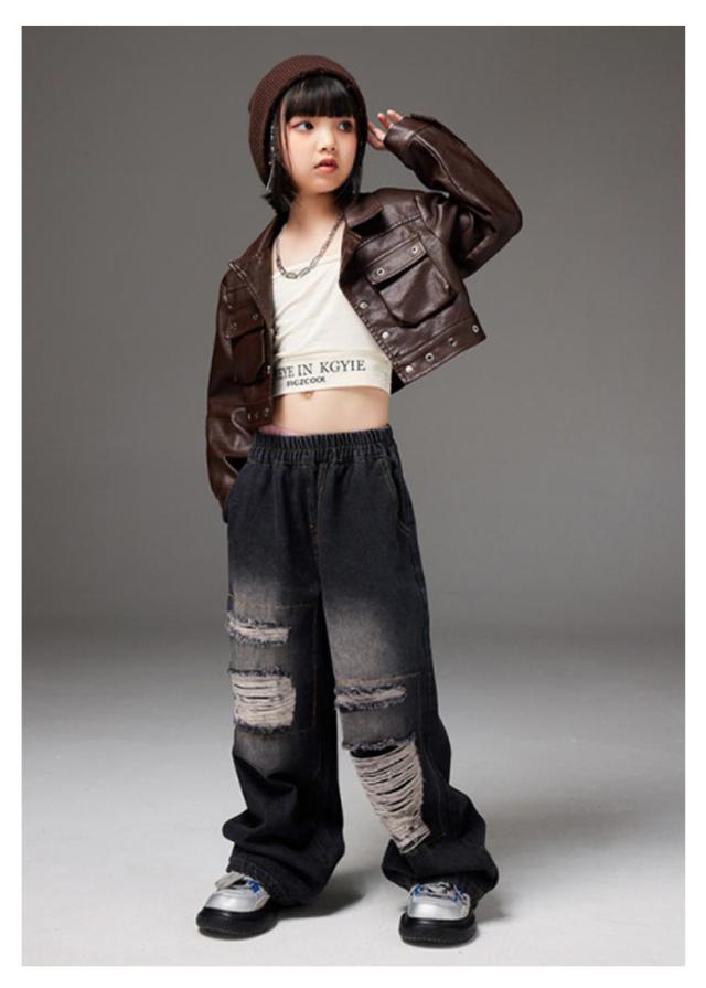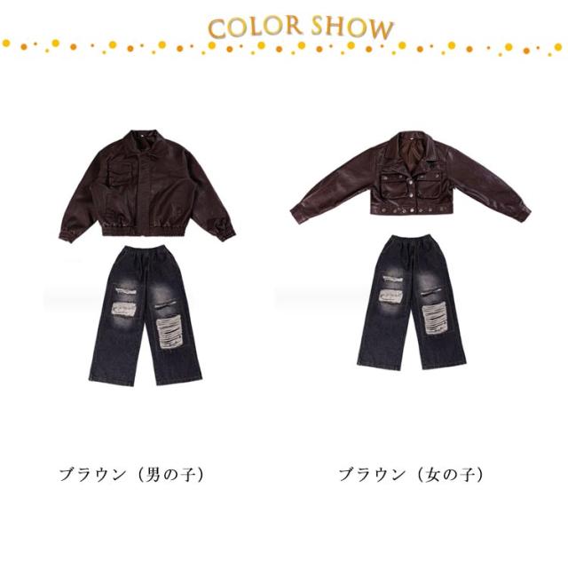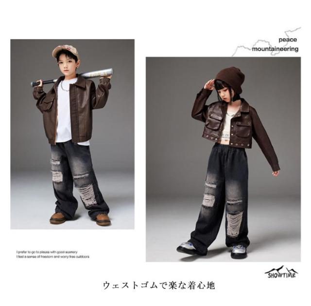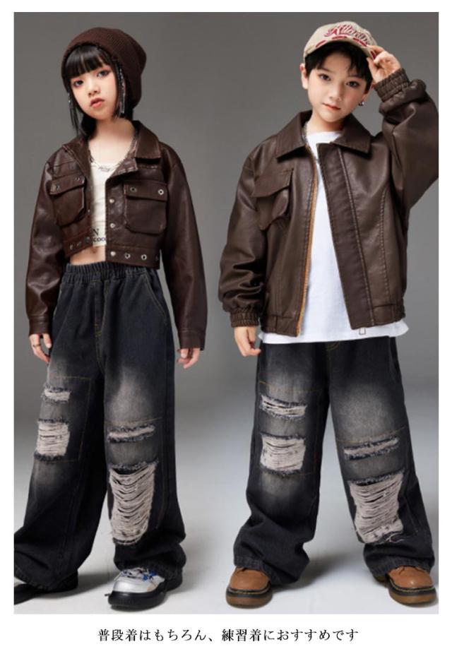 ジーパン デニムパンツ セットアップ PU革 ヒップホップ HIPHOP ブラウン デニム パンツ 男の子 キッズダンス衣装 ダメージ加工 ジーンズ ジャズダンス 女の子 キッズダンス衣装 ステージ衣装 K-PO パンツ ダンス
