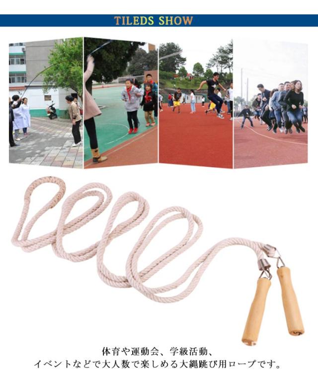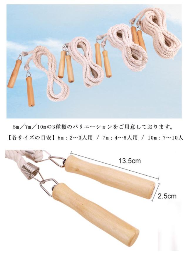 | 【5m/7m/10m】【大縄跳び】【団体用】 体育や運動会、学級活動、イベントなどで大人数で楽しめる大縄跳び用ロープです。 5m/7m/10mの3種類のバリエーションをご用意しております。 グリップは木製なので手になじみやすく、痛くなりにくい設計となっています。 木製グリップと縄の接続部は360°回転する金具で留められているので縄のねじれを防ぐ造りとなっております。 【各サイズの目安】5m:2〜3人用 / 7m:4〜6人用 / 10m:7〜10人 | |