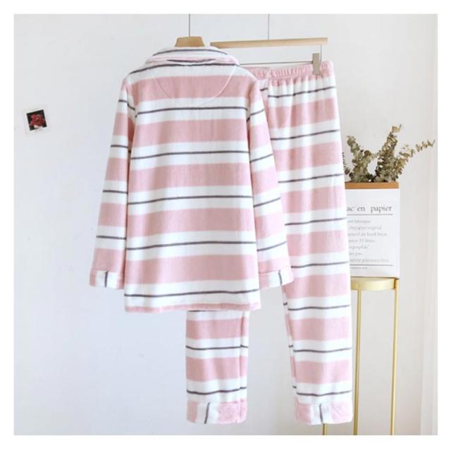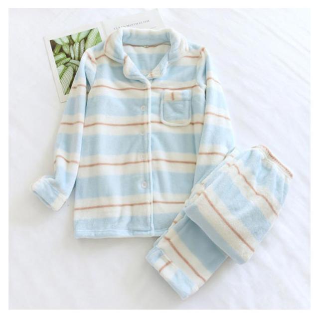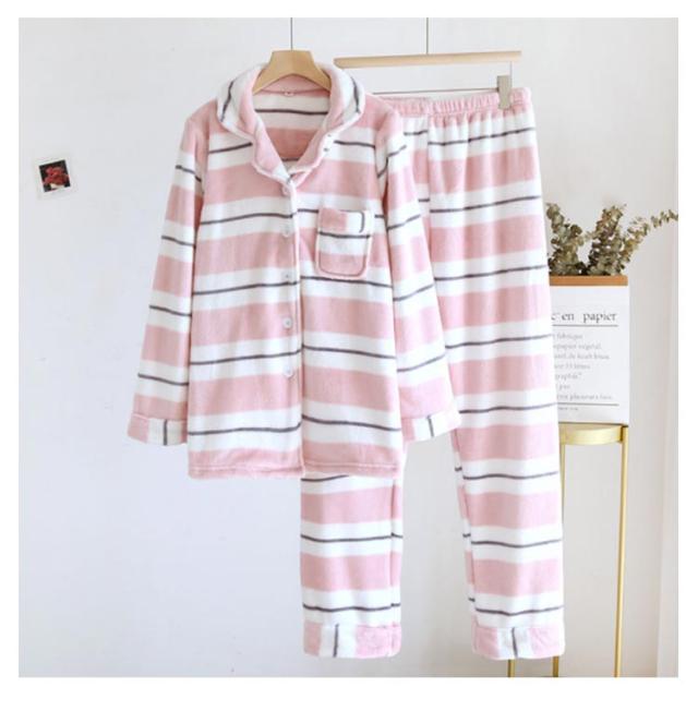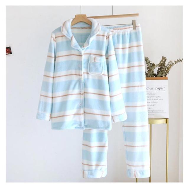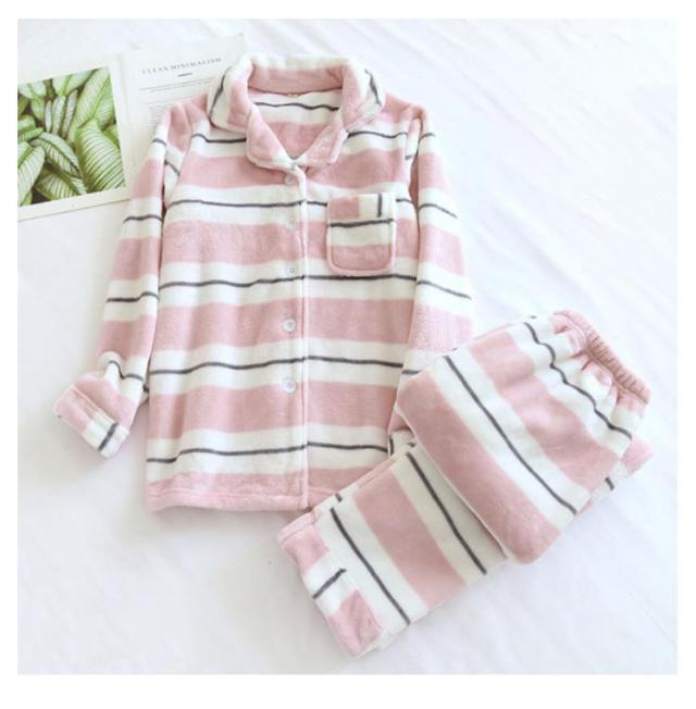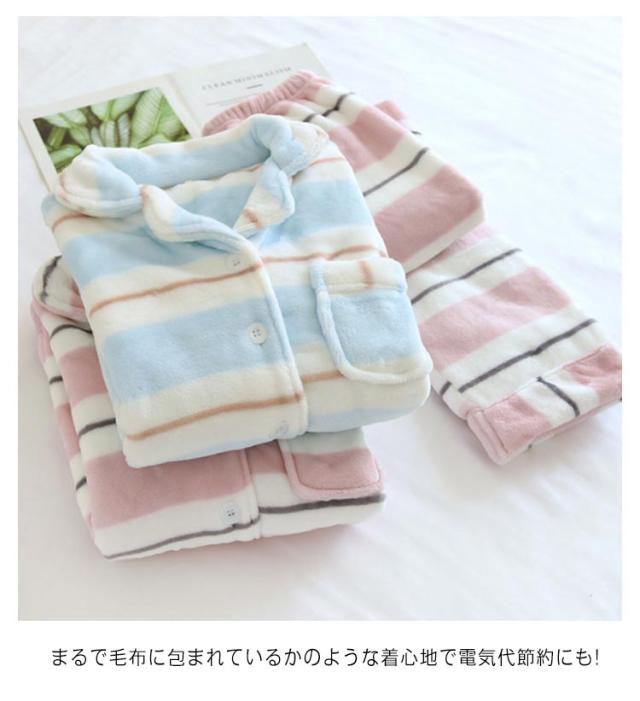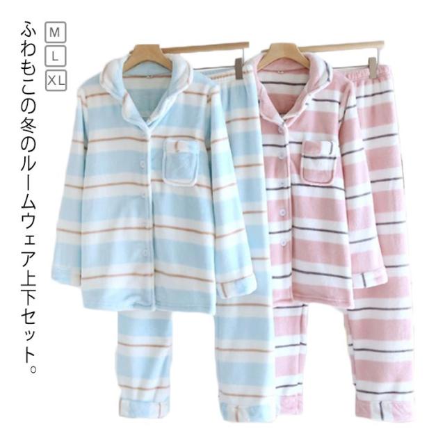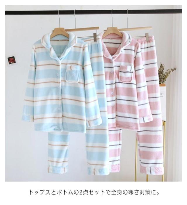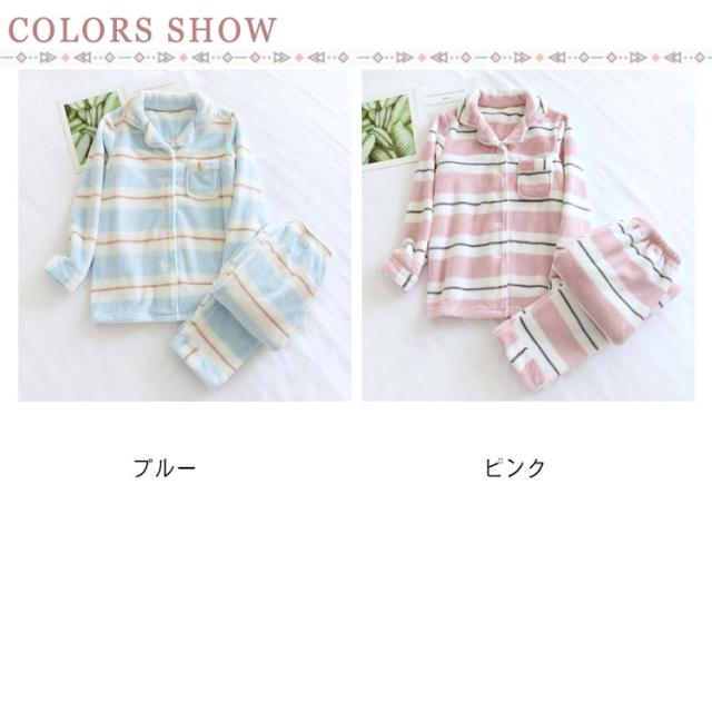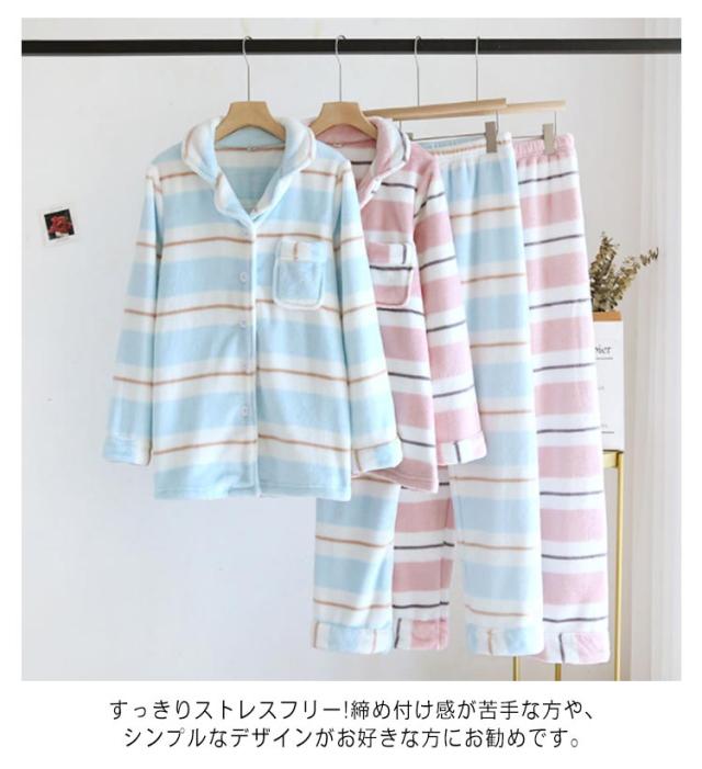 パジャマ レディース セットアップ 上下セット 寝巻 前開き 部屋着 かわいい おしゃれ ルームウェア パジャマ ボーダー ピンク ブルー ふんわり あったか 秋 冬 ギフト