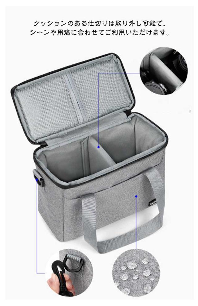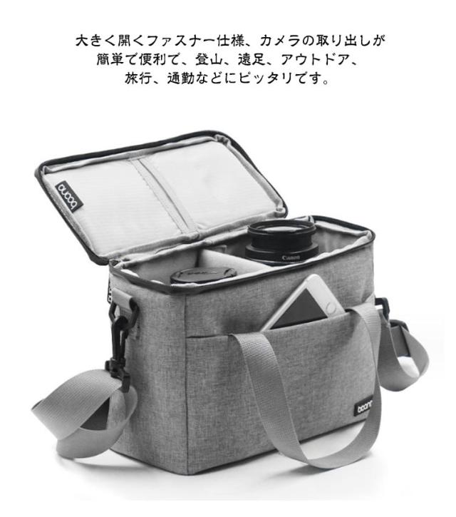 | クッション性・軽量・撥水性 機能性抜群のカメラバッグ。 本カメラバッグのクッション性が抜群で、カメラやアクセサリを不意の衝撃や傷から完全に保護できます。 耐水性に優れ、傷や汚れがつきにくい高品質の生地を使用しています。 大きく開くファスナー仕様、カメラの取り出しが簡単で便利で、登山、遠足、アウトドア、旅行、通勤などにピッタリです。 内側はメッシュポケットも付属で、sdカードやケーブルなどを収納するのに便利なカメラショルダーバッグ。 クッションのある仕切りは取り外し可能で、シーンや用途に合わせてご利用いただけます。 | |