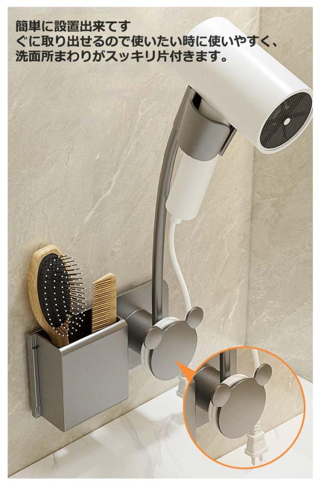 | ・両手で髪も乾かせるドライヤースタンド ・ハンズフリーでながら作業を実現 ・360度回転で簡単角度調節 ・しっかり固定できる頑丈設計 ・どこでも簡単取り付け ・ドライヤーを固定して両手が使える ・鏡やタイル等のツルっとした面に吸盤で取り付け可能です。 ・簡単に設置出来てすぐに取り出せるので使いたい時に使いやすく、洗面所まわりがスッキリ片付きます。 | |