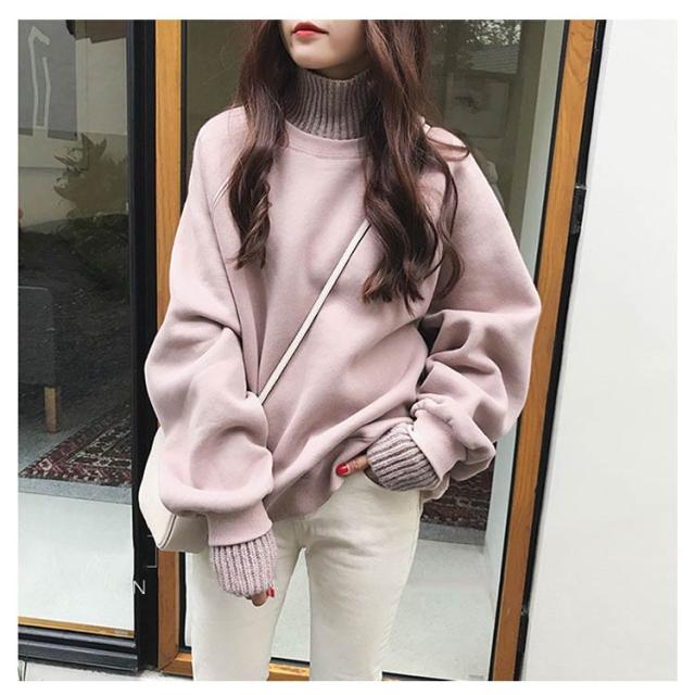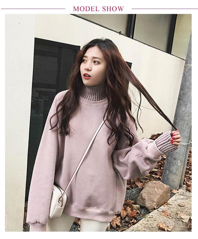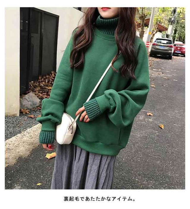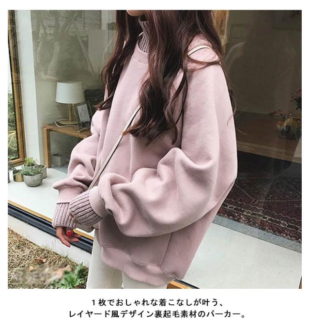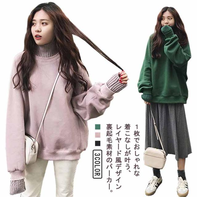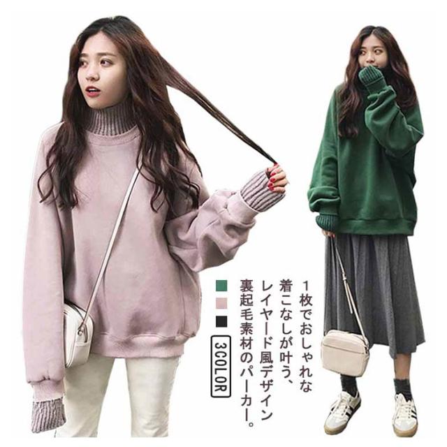 タートルネック 長袖 レイヤード おしゃれ スウェット トレーナー ハイネック 無地 パーカー プルオーバー レディース チュニック 重ね着風 ルームウェア トップス カットソー リブ 裏起毛 スリット 秋服 可愛い ピンク グリーン