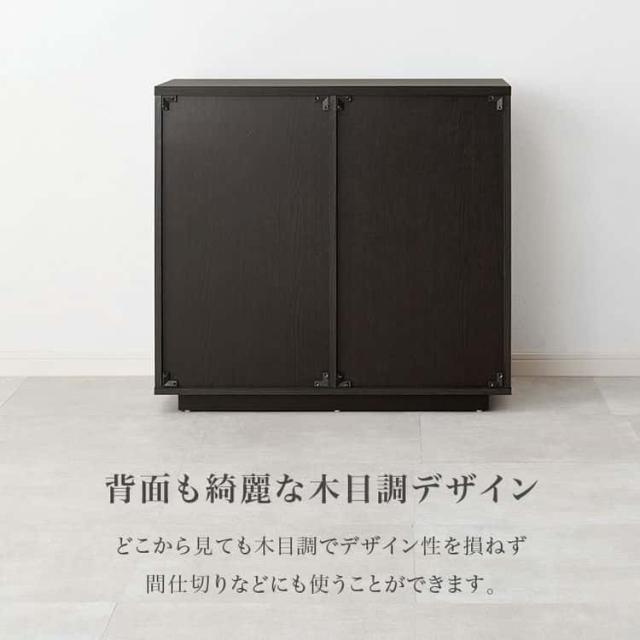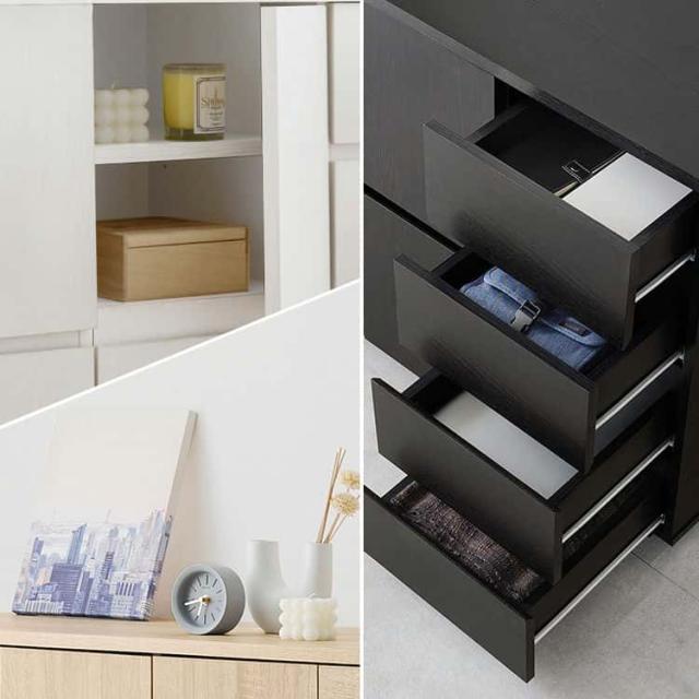 木目調デザインのシンプルなキャビネットで、生活感の出るものをひとまとめに収納できます。