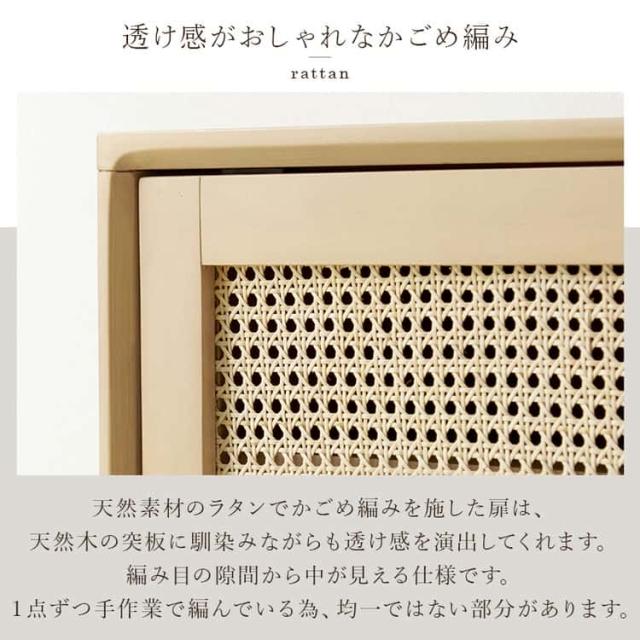 天然素材のラタンでかごめ編みを施した扉が、木のぬくもりに馴染みながら透け感を演出します。
