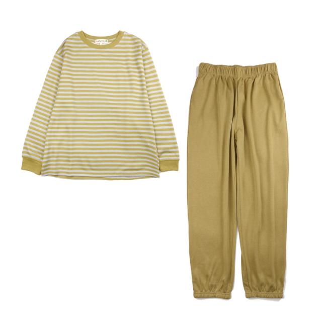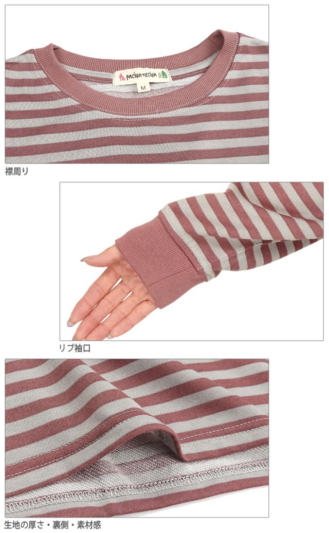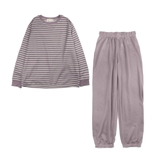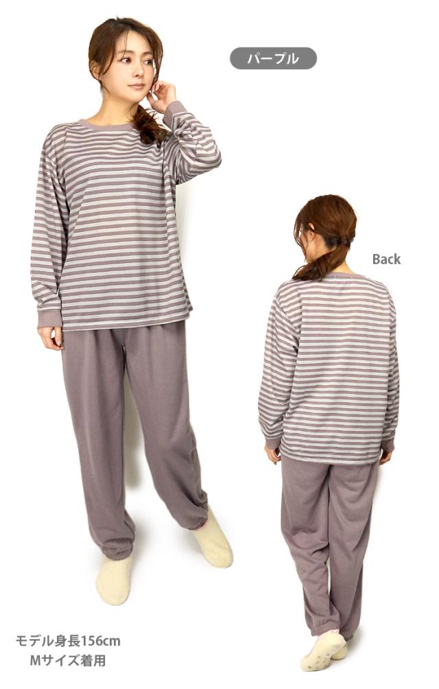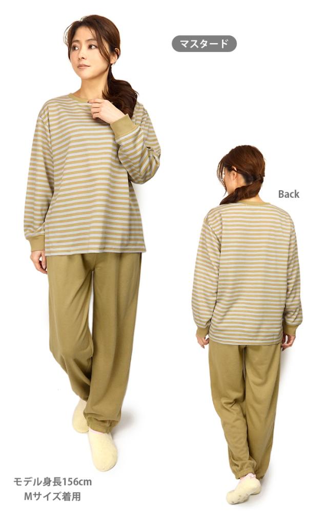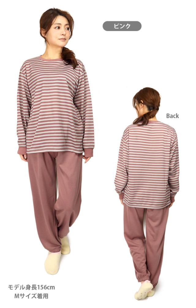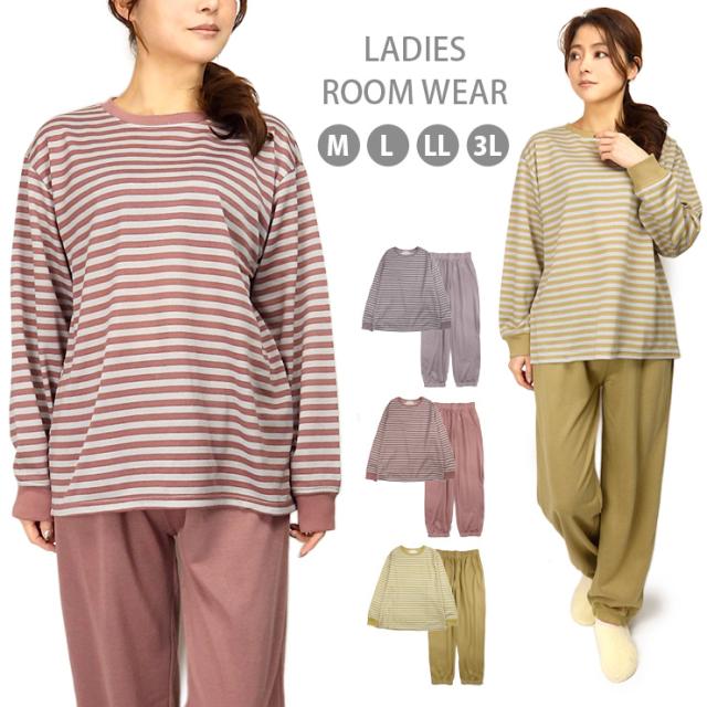 【送料無料】【大きいサイズあり】ボーダー柄 ルームウエア上下セットアップ レディース 春 秋 綿混 M L LL 3L 550272-1 550272L-1 長袖 部屋着 寝間着 パジャマ スエット スウェット トレーナー パンツ 長ズボン プルオーバー 薄地 薄手 パープル ピンク マスタード 2441