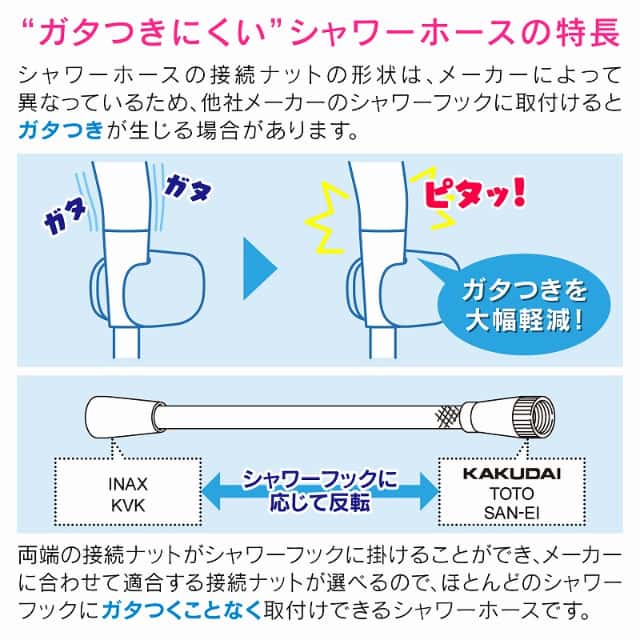 ・ほとんどのメーカーのシャワーフックとのガタつきを軽減するシャワーホースです。