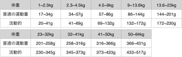 ・給与量は犬種、体質、生活環境、活動量、年齢、季節や気候などにより大きく違ってきます。上記給与目安量を目安として理想的な体重を維持できる最適な量に調整してください。