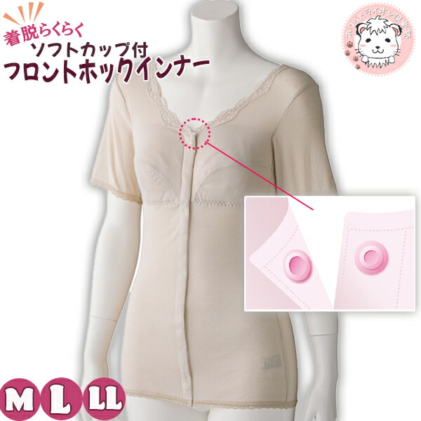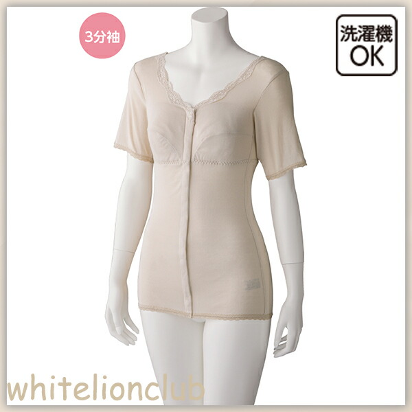 ソフトカップ付 3分袖 ホックシャツ アンダーゴム入り 綿100% カップ付インナー M/L/LL | 半袖 三分袖 前開き プラスチックホック式 ブラトップ