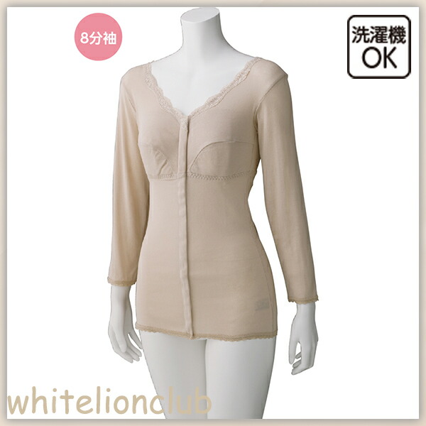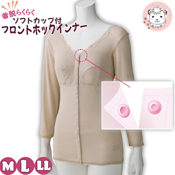 ソフトカップ付 8分袖 ホックシャツ アンダーゴム入り 綿100% カップ付インナー M/L/LL | 長袖 八分袖 前開き プラスチックホック式 ブラトップ