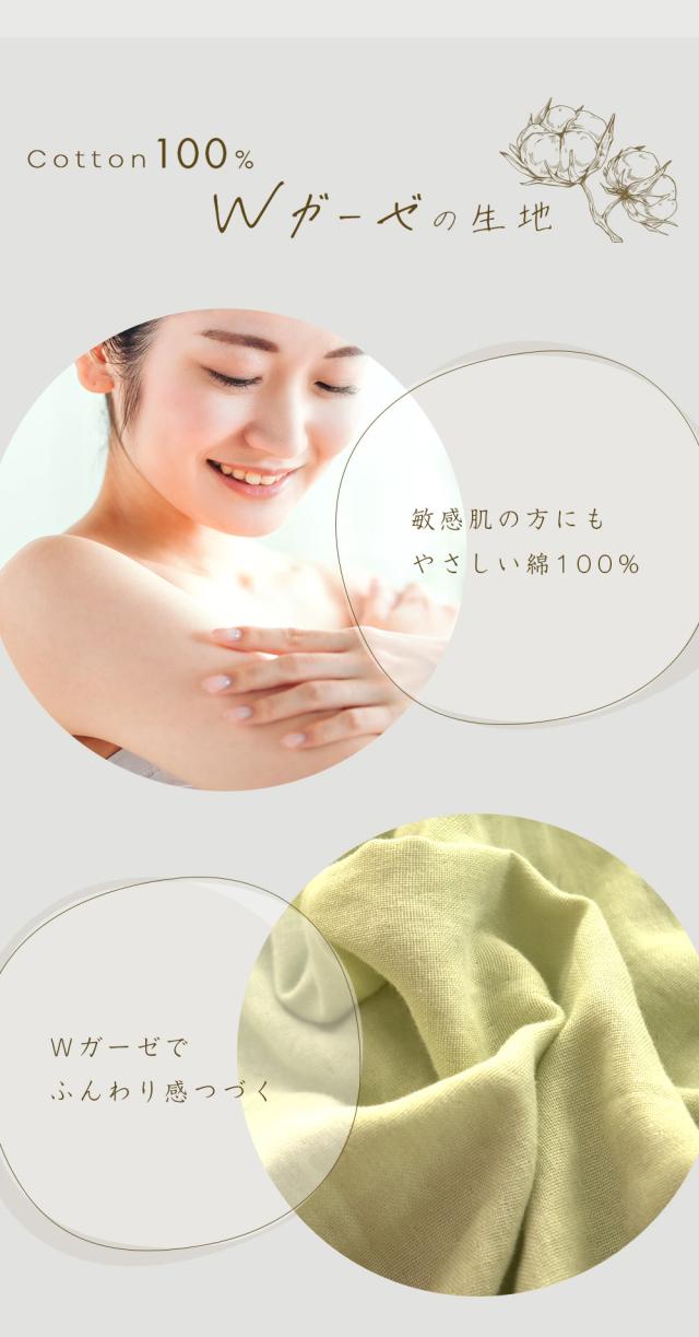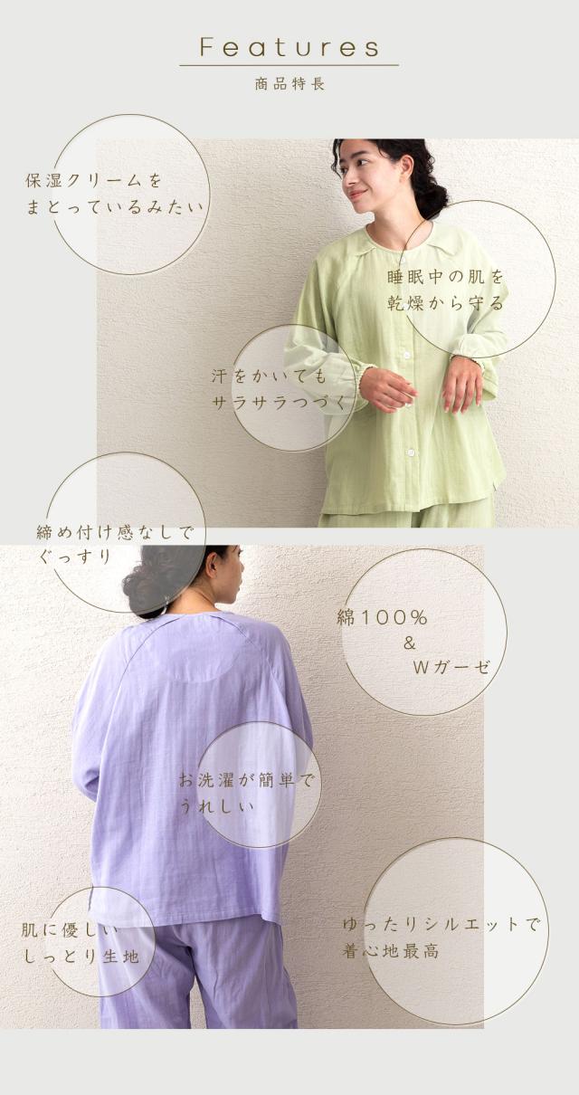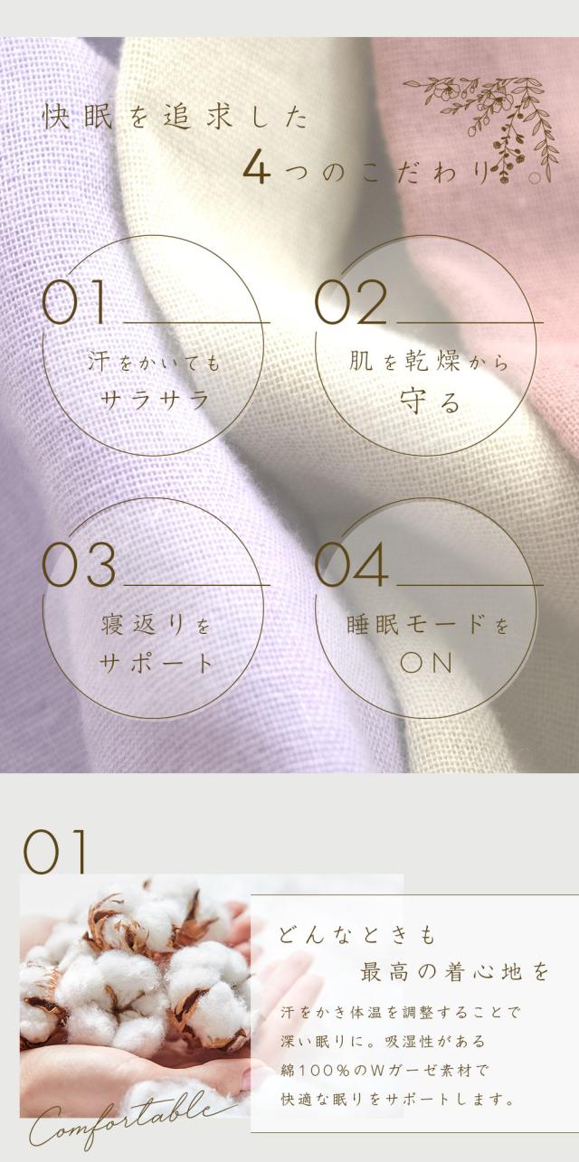 しっとりやわらかな綿100%のガーゼに天然由来成分をプラスしたスリーピングウエアです。睡眠中の肌を乾燥から守り、ゆったりシルエットでストレスのない寝返りをサポートします。