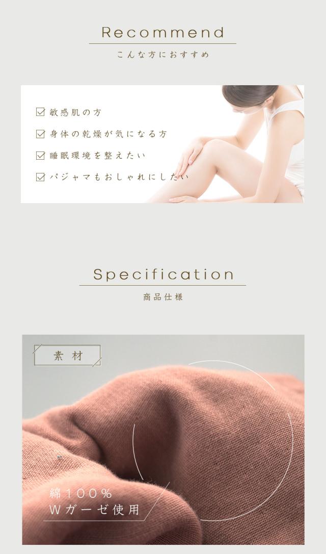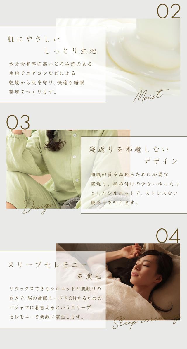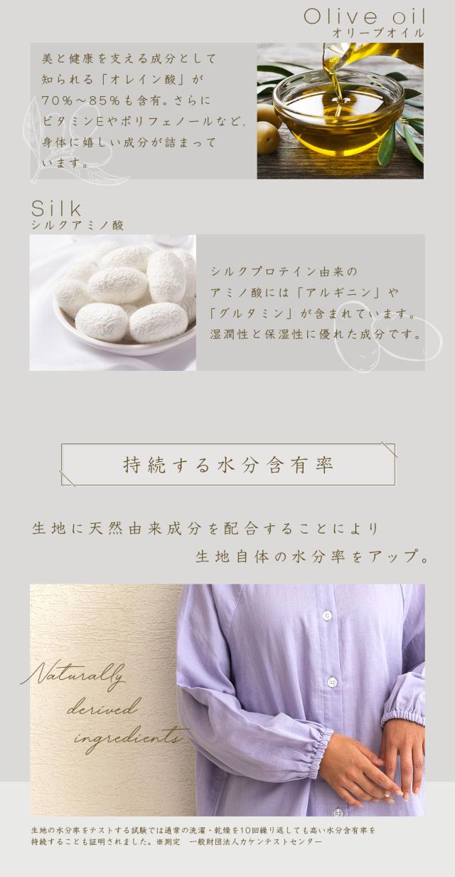 | 商品特徴 | 1、【天然由来成分】 "シアバター/オリーブオイル/シルクアミノ酸の贅沢成分を生地に配合。 綿100%のWガーゼ生地もお肌に安心です。" 2、【吸湿性】 "人は就寝後に汗をかく事で体温を調整し深い眠りにつくことができます。 吸湿性がある綿100%のガーゼ素材は就寝中も快適な眠りをサポートします。" 3、【水分保有率】 "快適な睡眠環境は就寝中のエアコンなどによる乾燥から肌を守ることが大切です。 水分率の高い生地を使用し包み込むような着心地と軽やかさを感じて下さい。" 4、【スリープセレモニー】 "就寝前にパジャマを着る行動は脳のスイッチを睡眠モードに切り替える効果があると言われています。 リラックスしたシルエットで肌触りのいいパジャマを着用する事でスリープセレモニーをより印象付けてくれます。" |