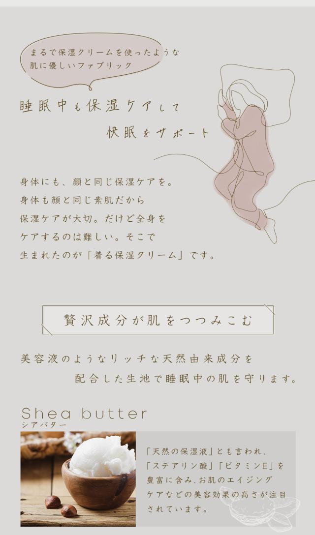 | 商品説明 | 生活様式の変化からストレスを感じる方も増加し『快眠』が近年注目されています。 「着る保湿クリーム」の生地に配合された天然由来成分で全身を優しく包み快眠をサポートします。 |