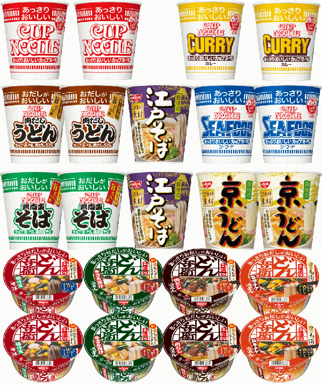 ●日清のあっさりおいしいカップヌードル、カップヌードル カレー、カップヌードル シーフード、カップヌードル 肉だしうどん、カップヌードル 鶏南蛮そば。