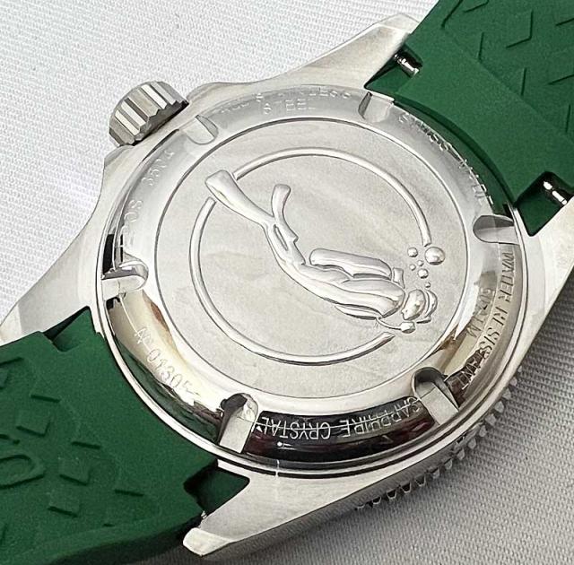 品番 3504GRR ケースサイズ 直径: 41.5mm / 厚さ: 13.3mm ケース素材 ステンレススチール ケースバック ステンレススチール ムーブメント 自動巻 SW200ベース 防水性 500m 機能 逆回転防止ベゼル、3時位置日付表示、ねじ込み式リューズヘリウムバルブ 風防 サファイアクリスタル ストラップ ラバーベルト 純正ケース、取扱説明書保証書完備 |