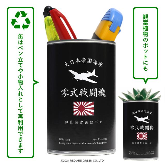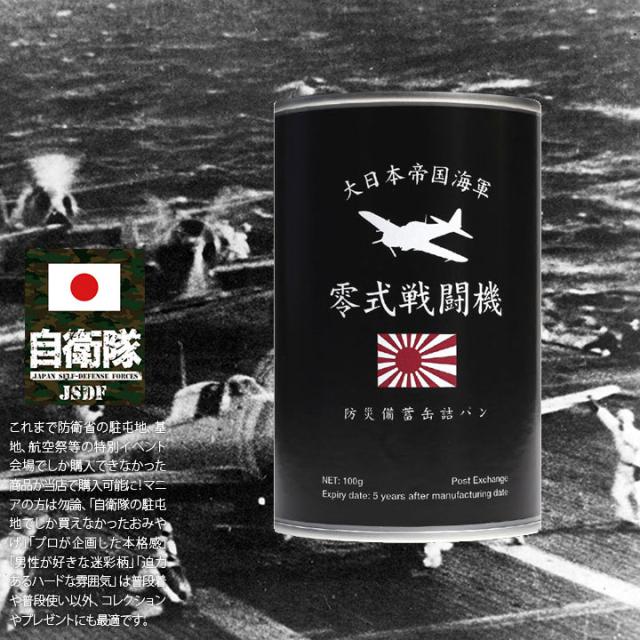 飛行する「ゼロ戦の勇姿」に加え、零式艦上戦闘機の意匠と大日本帝国海軍のアーチロゴ、十六条旭日旗(旧日本海軍旗)を冠した、缶詰タイプの非常用パンが登場!