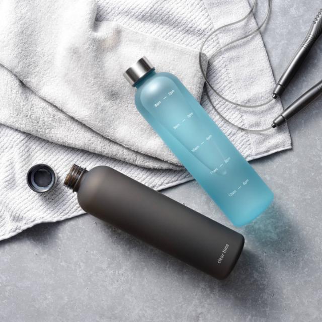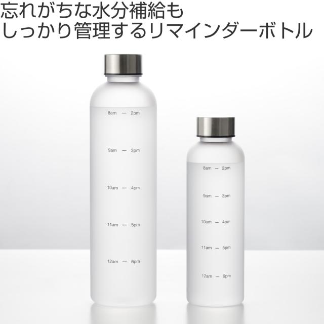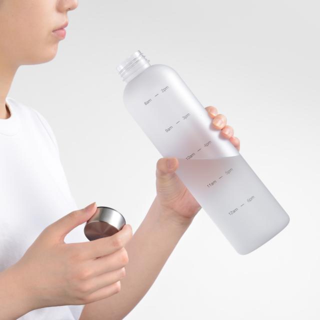 時間メモリ付のボトルです。書いてある時間を目安に水分を摂取する事で飲み忘れ防止につながります。透明なのでメモリが見やすく、残りの量が一目でわかります。1日2Lを目標にしたい方におすすめの容量1Lです。1日に2Lを目安に摂取したい方は、2回分水を充填し飲む事で、目安量を摂取する事が可能です。
