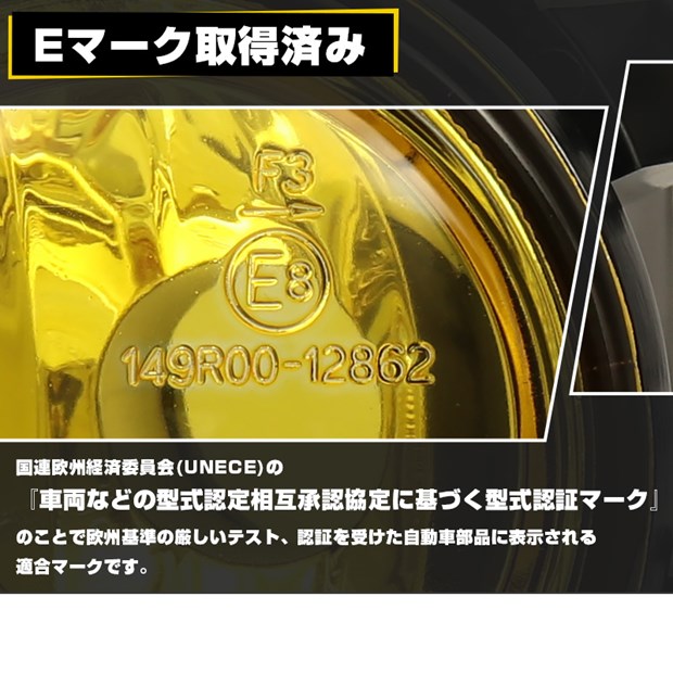 上記の性能で欧州基準の厳しいテストをクリアし、認証を受けた自動車部品に表示するEマーク認証を取得済みです。