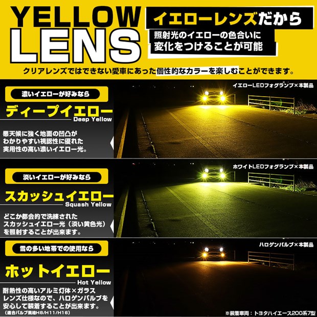 イエローレンズ仕様なので装着するバルブ照射光で色変化を楽しめます。