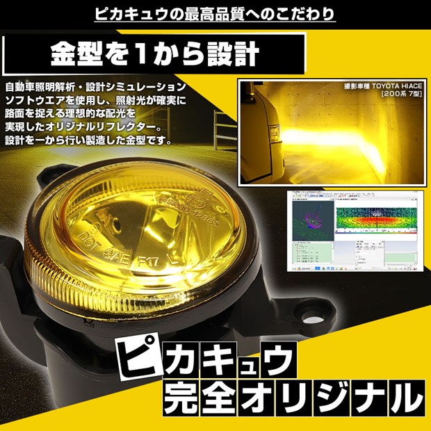 自動車照明解析・設計シミュレーションソフトウエアを使用し、照射光が確実に路面を捉える理想的な配光を実現したオリジナルリフレクター。設計を一から行い製造したピカキュウ完全オリジナルです。