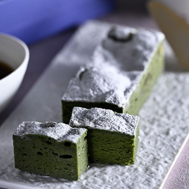 深い緑色に粉糖をあしらったシックな装い。愛知特産の香り高い西尾の抹茶を使ったガトーショコラだ。口あたりはしっとり、こっくり。鹿児島産サトウキビ糖のやさしい甘さにより際立つ、嫌みのない濃厚な旨みと少しのビター感がたまらない。抹茶好き垂涎の逸品を2本セットで。