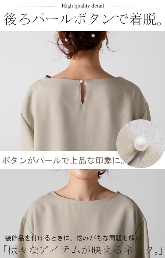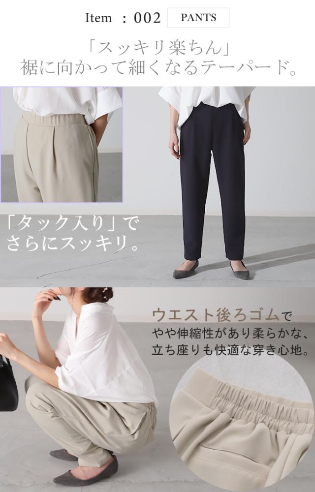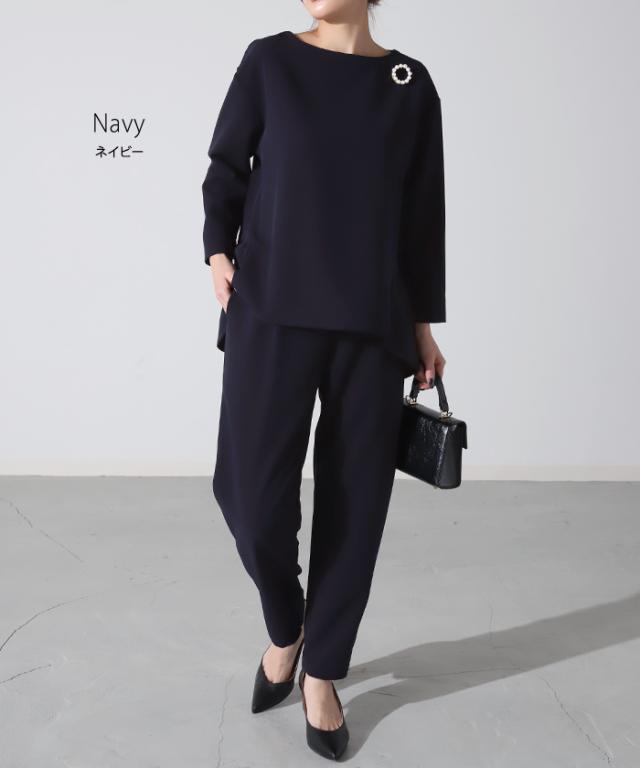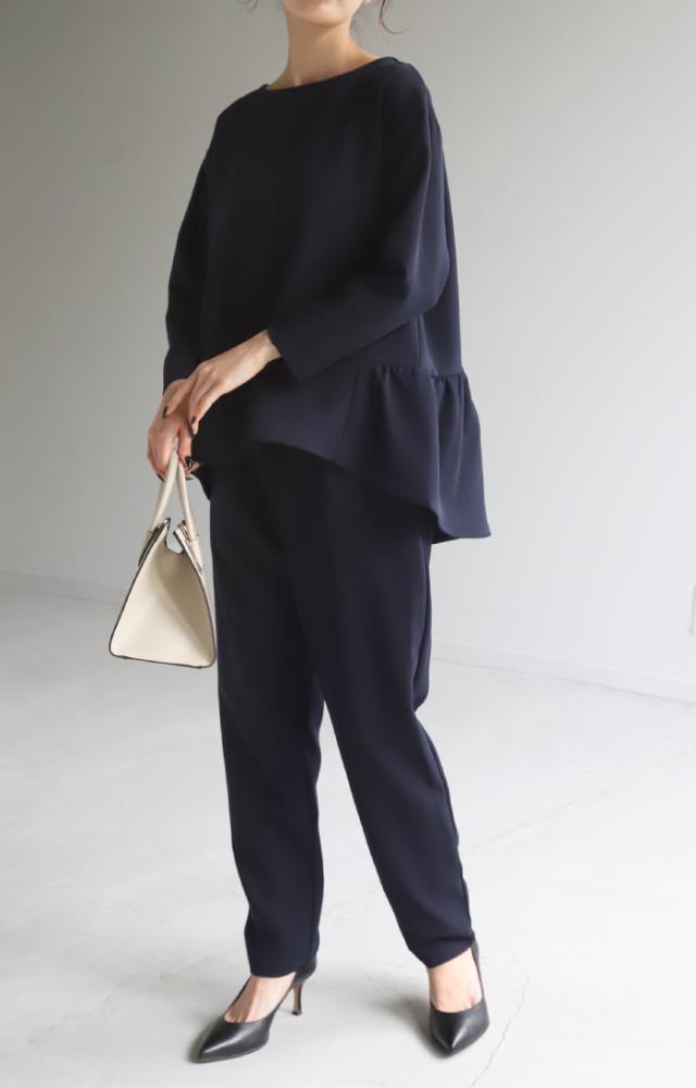 デコルテラインをきれいに見せてくれるボートネックが女性らしい雰囲気に、パンツはすっきりとしたシルエットに仕上げました。