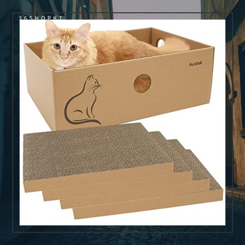 AUSCAT 猫爪とぎ 猫用段ボールつめとぎ 取り換え用爪研ぎ4枚入り 猫ベッド兼用 箱型 37×27×13CM