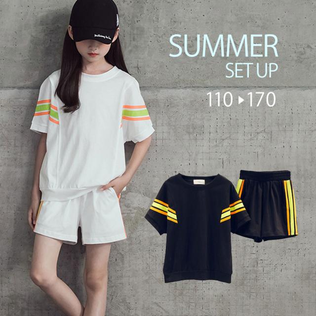 子供服 セットアップ 女の子 韓国 風 キッズ ファッション 上下 2点 セット 送料無料 おしゃれ かわいい カジュアル 美脚 スポーツ 運動 半袖 夏 ネオンカラー 黒 部屋着 ルームウェア 選べる 2カラー 子ども ジュニア