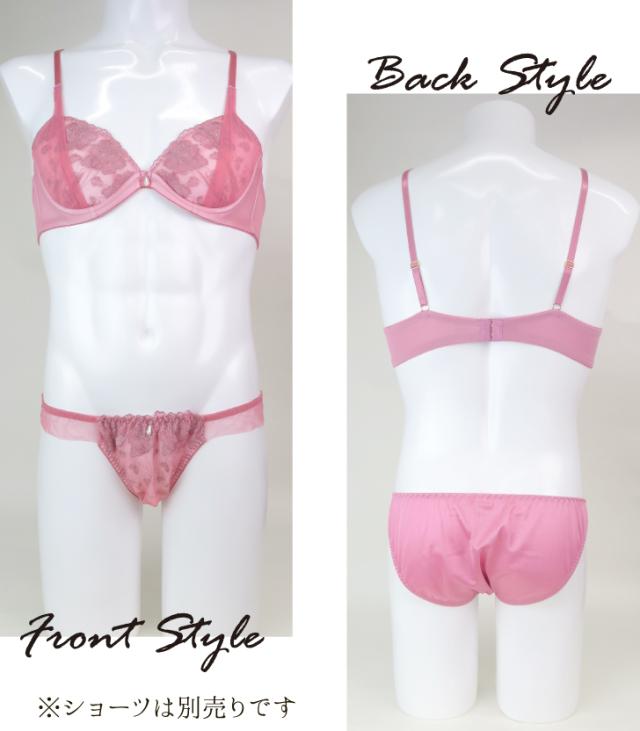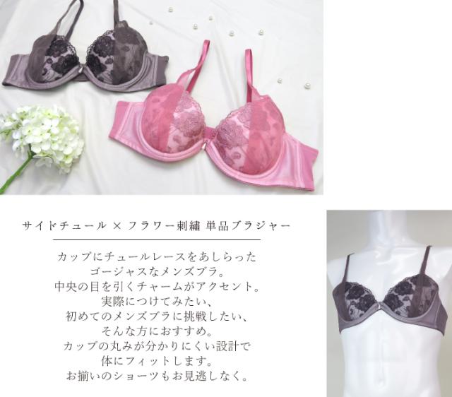 カップにチュールレースをあしらったゴージャスなメンズブラ。中央の目を引くチャームがアクセント。実際につけてみたい、初めてのメンズブラに挑戦したい、そんな方におすすめ。カップの丸みが分かりにくく、設計で体にフィットします。お揃いのショーツもお見逃しなく。