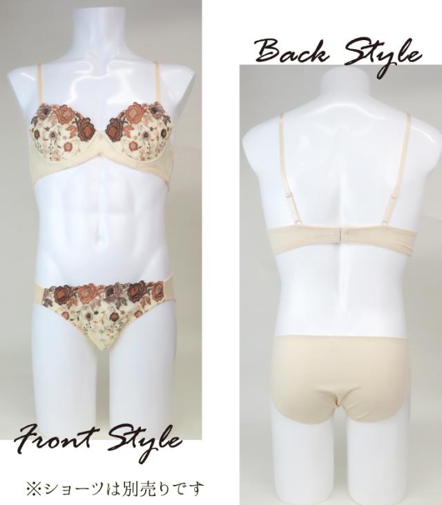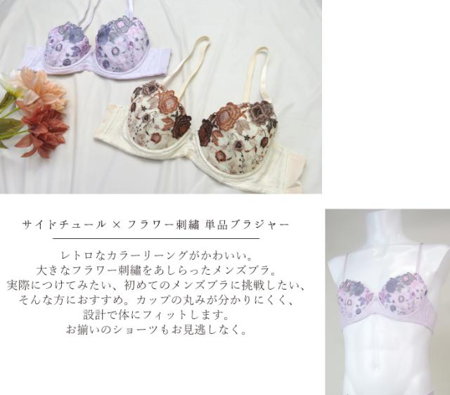 レトロなカラーリーングがかわいい。大きなフラワー刺?をあしらったメンズブラ。実際につけてみたい、初めてのメンズブラに挑戦したい、そんな方におすすめ。カップの丸みが分かりにくく、設計で体にフィットします。お揃いのショーツもお見逃しなく。