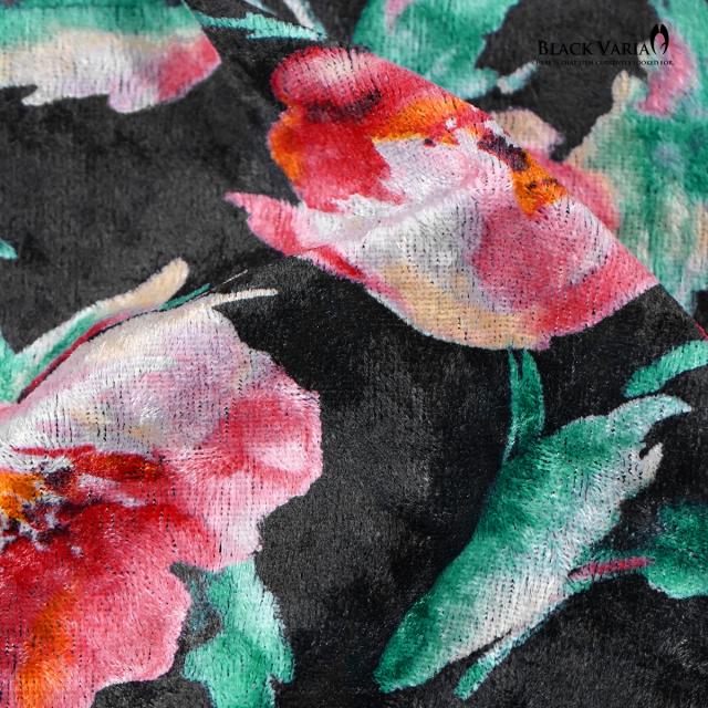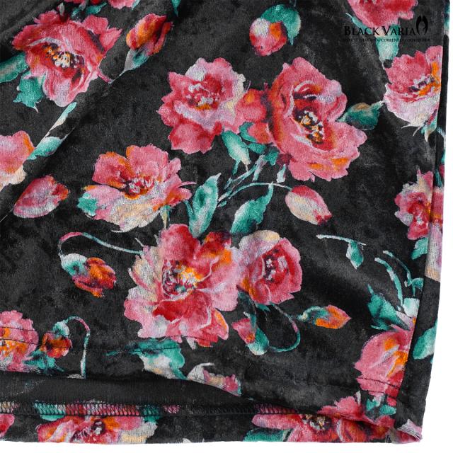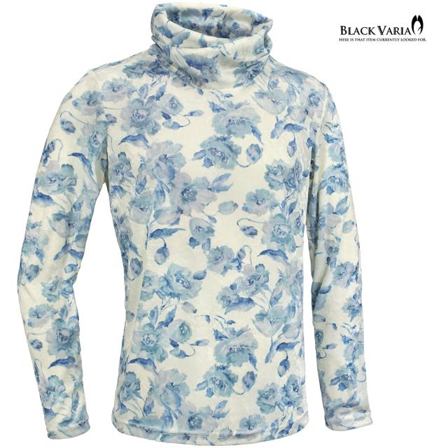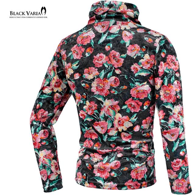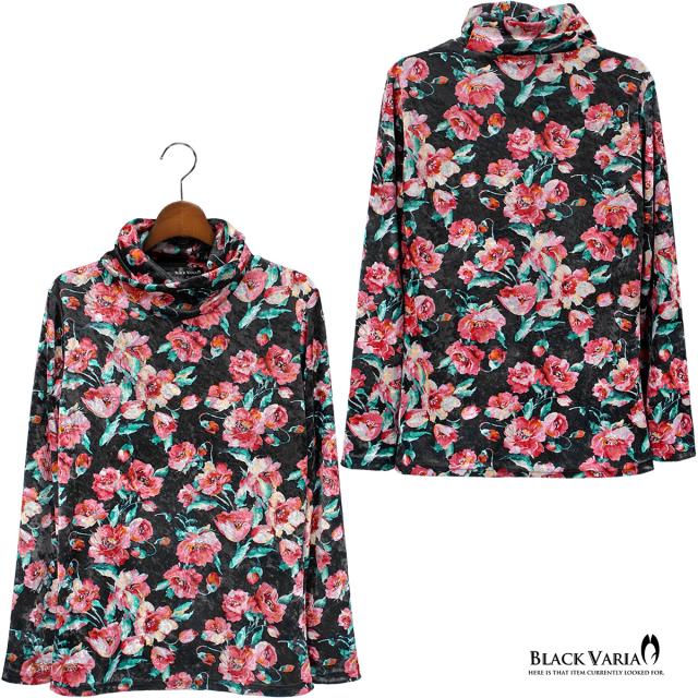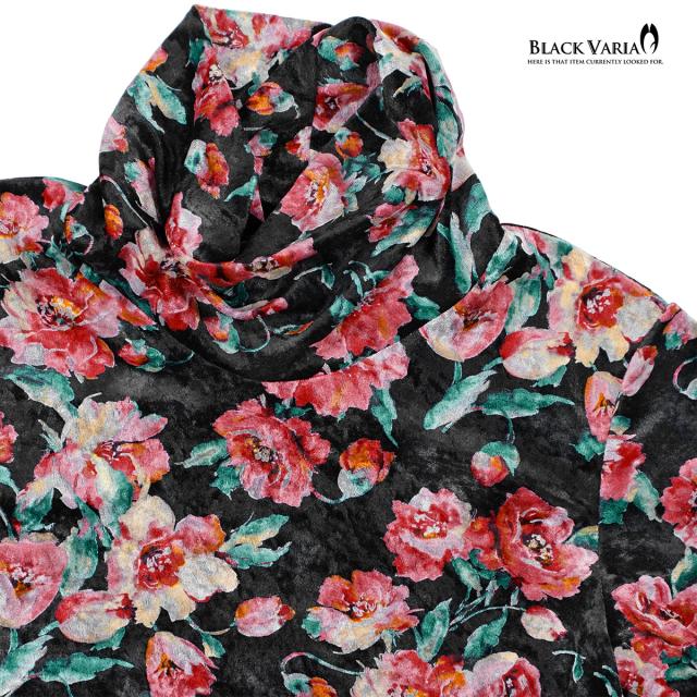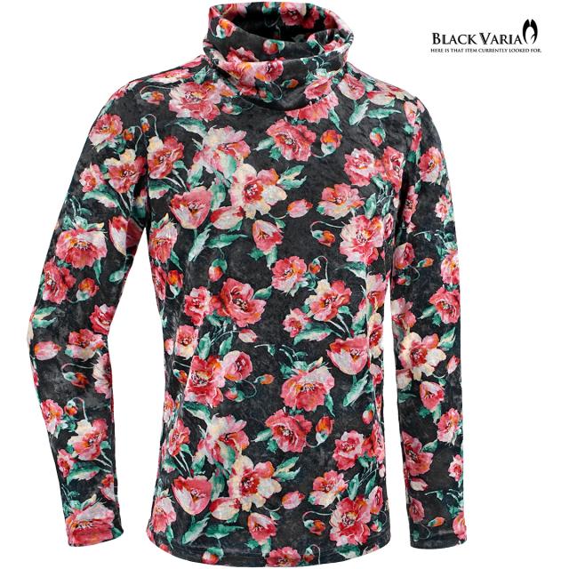 タートルネック ねじれ襟 くしゅくしゅ 花柄 ベロア 薔薇 メンズ 長袖 ストレッチ mens(ブラック黒レッド赤) 233701