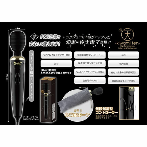 【送料無料】極天 -kiwami ten- 漆黒 電動マッサージ機 電動マッサージ器 静音 電マ 最新 ハイパワー 強力 女性向け ハンディ ACアダプター 収納ポーチ 医療用二層シリコン