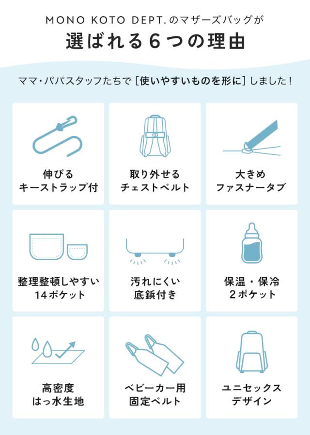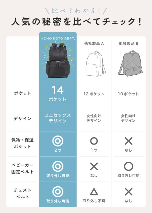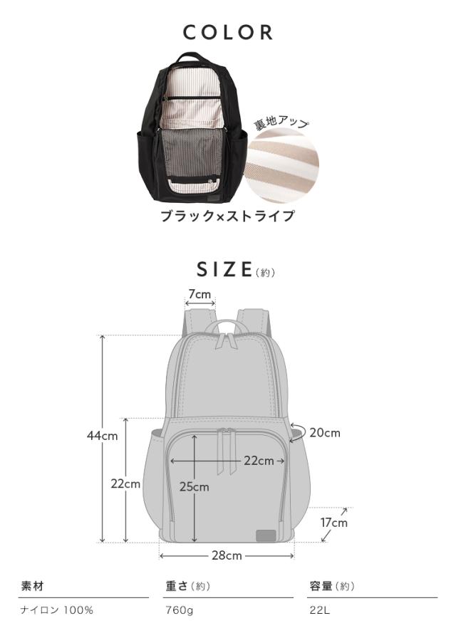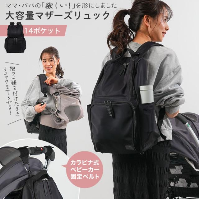 【商品説明】 リュックタイプのマザーズバッグ。 ママ・パパスタッフたちで「使いやすいものを形に」しました! ポケットの位置や大きさ、底鋲の有無やキーチェーンの長さなど、 こだわりにこだわって商品開発を行ったみんなのわがままを叶えたバッグです。 計14個の豊富なポケットは保冷保温・メッシュなど機能面も充実。 スーツケースやベビーカーに固定できるベルト付きで 移動や旅行先でもらくらく!! 【注意】 ※本製品のカラビナは登山用ではありません。 横からの強い衝撃を加えた場合、バネが破損する場合がございます。 ※荷物の掛け過ぎに等にご注意ください。赤ちゃんより軽い荷物でご使用ください。 ※バッグの中に入れる物にも色移りする恐れがあります。特に淡色系の物はご注意ください。 ※雨や水に濡らした場合は、素早く乾いた柔らかい布で水気を取り、形を整えて必ず陰干ししてください。 ※高温、多湿を避け、風通しの良い場所に保存してください。 ■サイズ 縦44cm × 横28cm × 奥行17cm ■カラー ブラック×ストライプ ■素材 ナイロン100% ■重量 760g ■容量 約22L |
