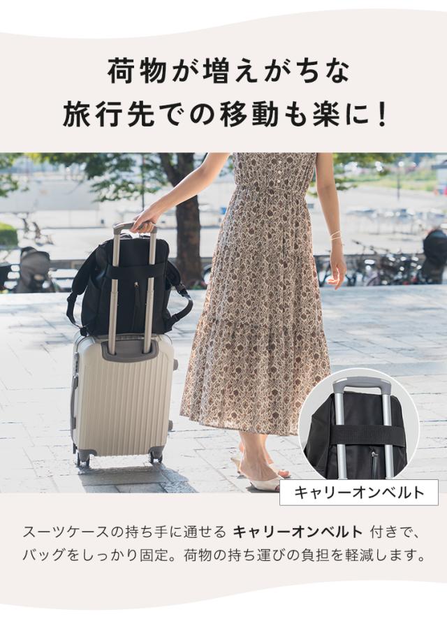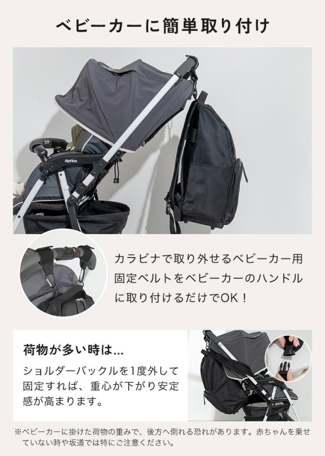 スーツケースやベビーカーに固定できるベルト付きで