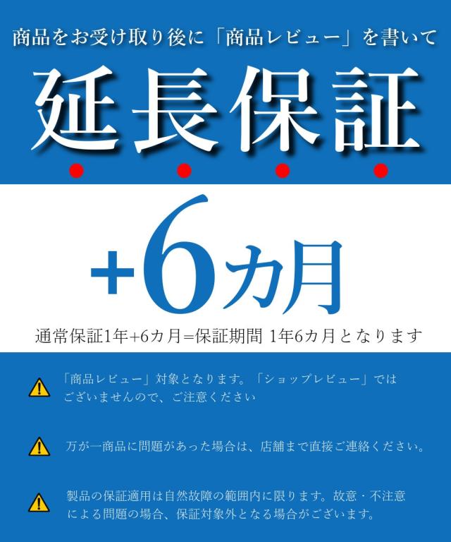 | 保証期間 | 商品が届いてから1年間 水濡れ・破損・改造など不適切とみなされた使用に起因する故障や、自然故障以外の不具合は補償の対象外となります。 保証対象外製品をご返送いただいた場合、返金交換の対応ができない場合がございます。あらかじめご了承くださいませ。 |