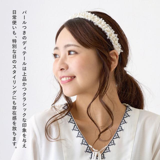 パールつきのディテールが上品かつクラシカルな印象を与え、髪型を華やかに引き立ててくれる、優雅でレディライクなデザインです。