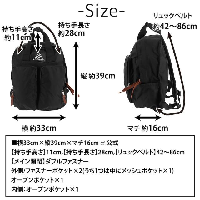 | サイズ(約) ※当店実寸値 | 横33cm×縦39cm×マチ16cm ※公式 【持ち手高さ】11cm 【持ち手長さ】28cm 【リュックベルト】42〜86cm | ||