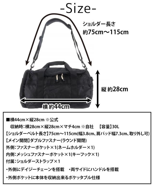 | サイズ(約) ※当店実寸値 | 公式サイズ 横44cm×縦28cm 自社採寸サイズ 収納時:横28cm×縦28cm×マチ4cm 【ショルダーベルト長さ】75cm〜115cm(ショルダー幅3.8cm、肩パッド幅7.3cm、取り外し可) 【容量】30L ※収納時のサイズは目安になります | ||