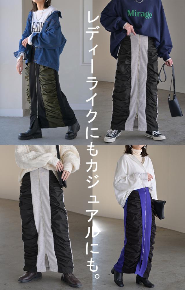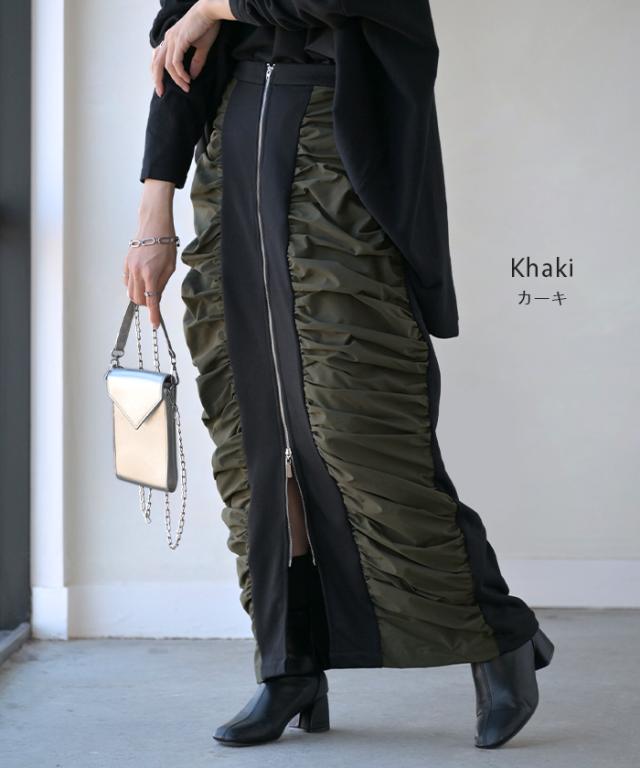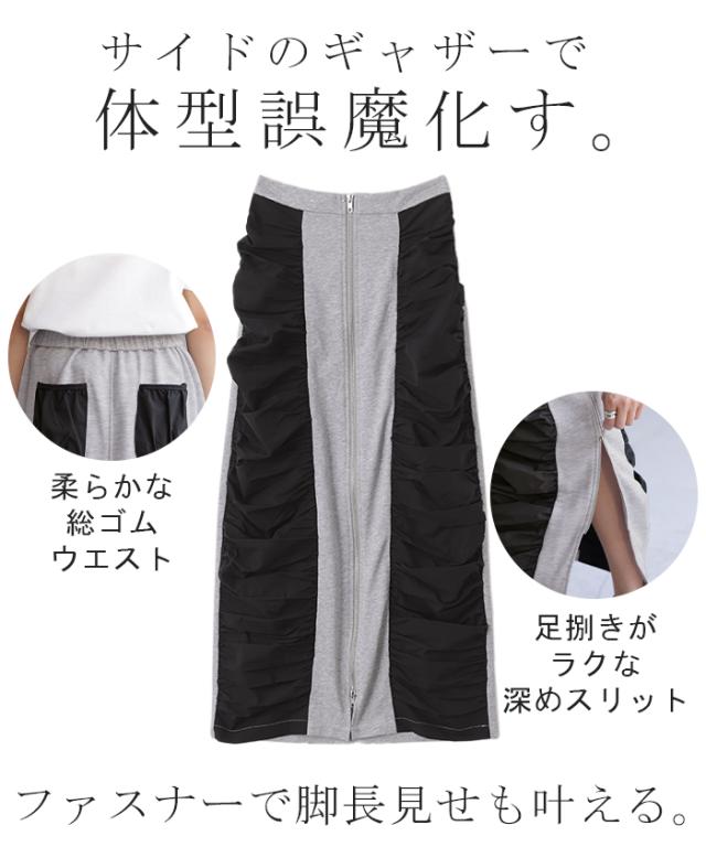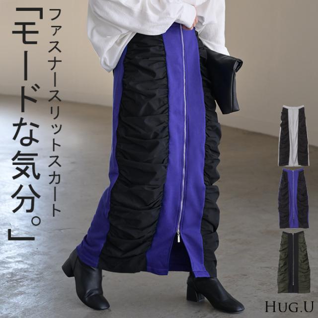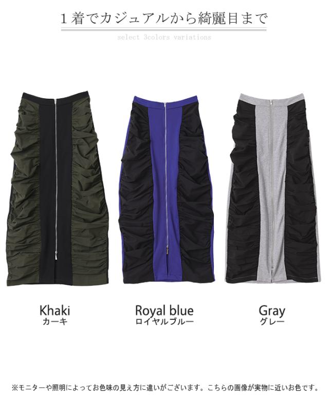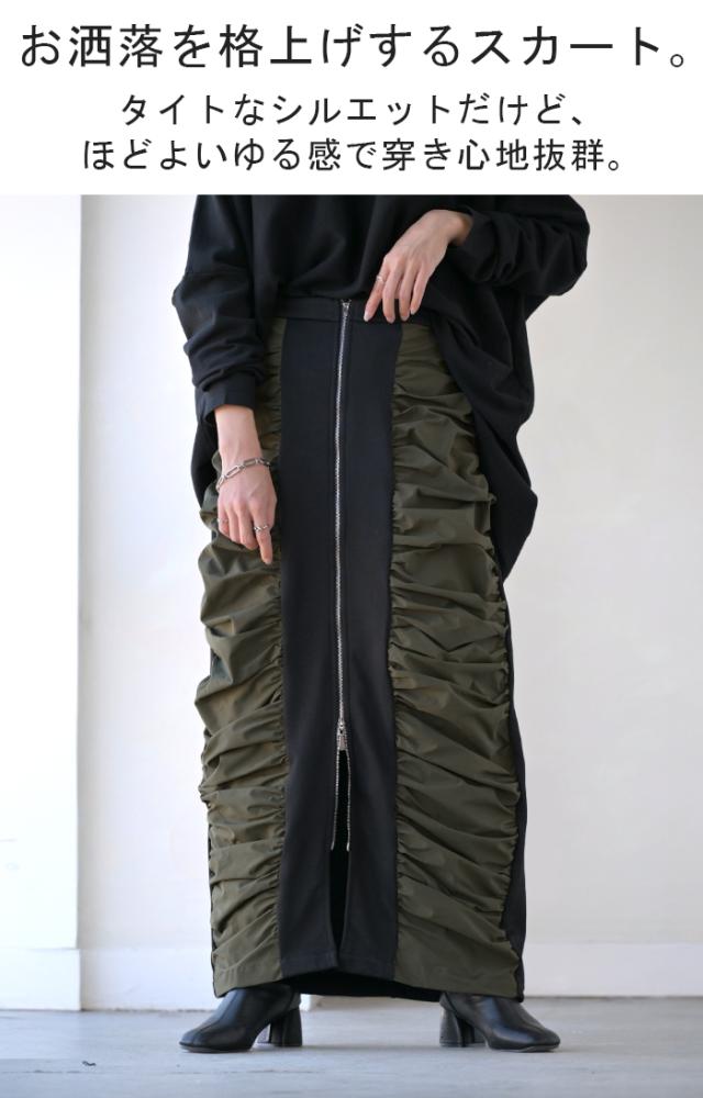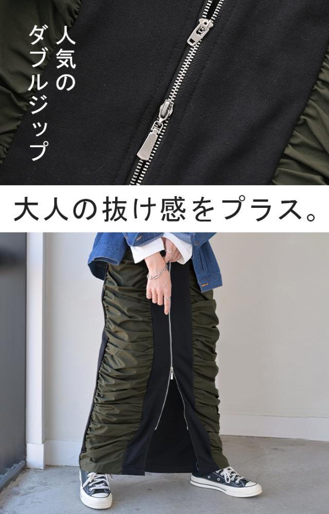 スカート サイド ギャザー タイトスカート レディース ボトムス 変形 ロングスカート マキシスカート スウェット 変形スカート ダブルジップ ストレート スリット ストレッチ ロング タイト ナロースカート ゴム カーキ 春 冬 HUG.U 秋新作