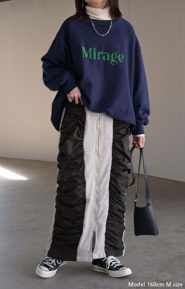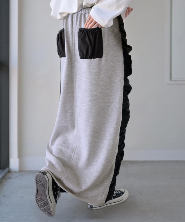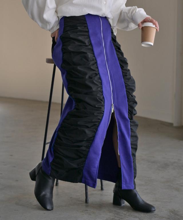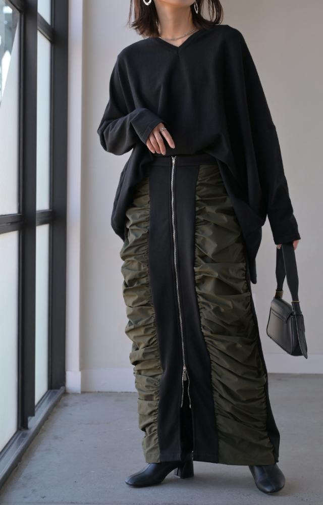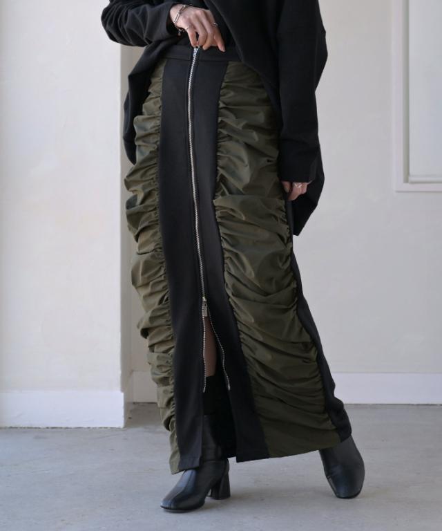 シャーリング切り替えデザインの個性的なロングスカートです。