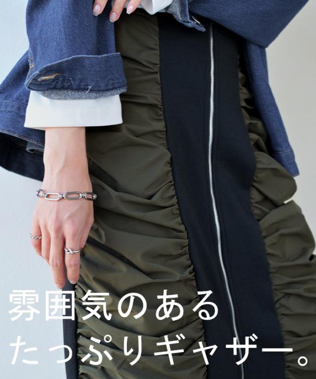 中央部分に施されたギャザーがIラインシルエットを演出しレディライクな印象に。