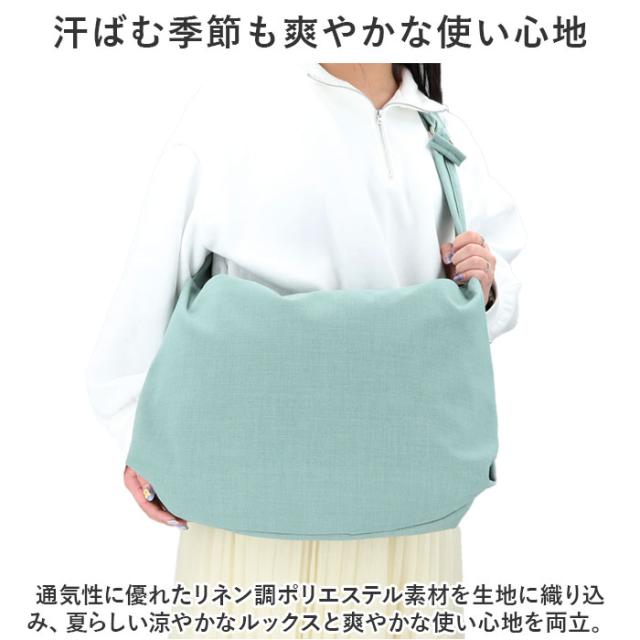| 商品説明 | ・真夏の肌に、サラッと優しい素材感。「Legato Largo」で人気の「ハンモックリネン調シリーズ」に、「ビッグサイズワンショルダー」が仲間入り。 【汗ばむ季節も爽やかな使い心地】 ・蒸し暑い季節でもサラッと快適。通気性に優れたリネン調ポリエステル素材を生地に織り込み、夏らしい涼やかなルックスと爽やかな使い心地を両立。 【女性らしい柔らかなシルエット】 ・丸みのあるクレセント型シルエットが体のラインにフィットして、いつものスタイルに女性らしい柔らかな雰囲気をプラス! 【安心の天ファスナータイプ】 ・メインルーム開口部は、小物がこぼれ落ちる心配のない天ファスナー仕様。外出先でのプライバシーもしっかりキープ。 【スリムに見えて、たっぷり収納】 ・メインルームは通勤通学に便利なA4対応サイズ。ビジネスファイルやテキストはもちろん、薄手のアウターもすっぽり入り、スリムなフォルムでも収納力は抜群! 【整理に役立つインナーポケット】 ・メインルーム内側に、スマホなど日常使いの小物がちょこんとしまえる、文庫本サイズのインナーポケット付き。 【両サイドに小物ポケット付き】 ・バッグ両サイドにパスケースがサッと取り出せる縦型ファスナーを2ヶ所配置。ファスナーが目立たないように仕上げてあるのがポイント! 【軽量&ソフトな素材感】 ・幅広に仕上げたショルダーベルトも、ふんわり肩に優しいリネン調ポリ素材。長さが自在に調節できるシルバーカラーのリングバックルがアクセント。 【手軽に“洗えるかばん”】 ・毎日使うカバンだから、いつも清潔に。敢えて特別な加工を施さないナチュラルな素材使いで、手軽にお手入れができるウォッシャブル仕様。(※洗濯ネットに入れてお洗濯してください。) 【肌に馴染む、自分だけバッグに】 ・ハンモックに揺られてまどろむひと時のように、ふんわり優しい風合い。くったりと柔らかな生地感と、洗うごとに自分色に染まっていく表情の変化が楽しめるのも魅力のひとつ。 【ポケット仕様】 [メインルーム内側]ファスナーポケット×1 [外側両側面]ファスナーポケット×2 |