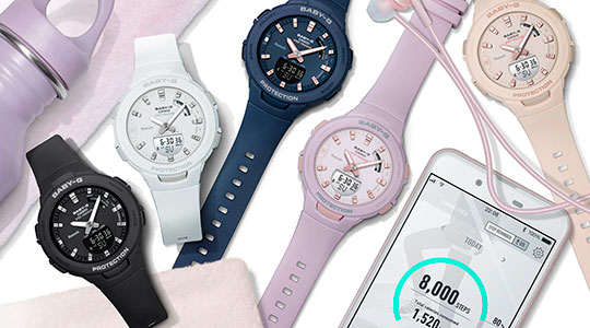 3軸加速度センサーによる歩数計測機能、最大5本×20セットの計測が可能なタイマー、ラップメモリー最大200本、一定時間の間に歩数が少ないとお知らせするステップリマインダー機能など、日常の健康管理やスポーツ時に役立つ機能を搭載。また、BABY-G初となる、スマートフォンリンク機能が搭載され、Bluetooth通信による専用アプリケーション「BABY-G Connected」との連携で、日々の活動記録管理や運動設定がスマートフォン側からの簡単操作で実現しました。