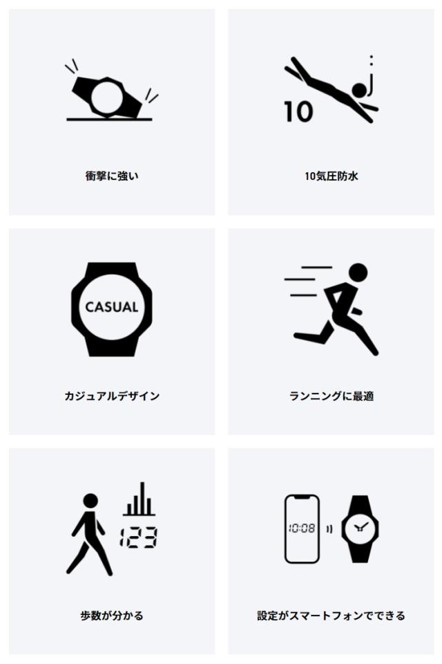 カロリー算出や目標歩数設定、更にタイマーメニュー作成+転送、5段階運動強度付歩数ログ、ストップウオッチ計測データ保管、カレンダーでのデータ一括確認などが可能です。アプリ連携により、自動時刻修正など時計本来の機能も追求しています。