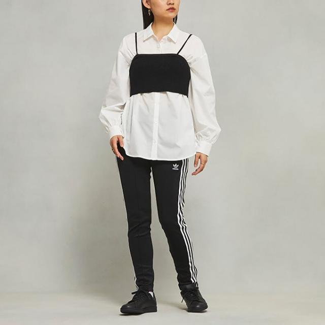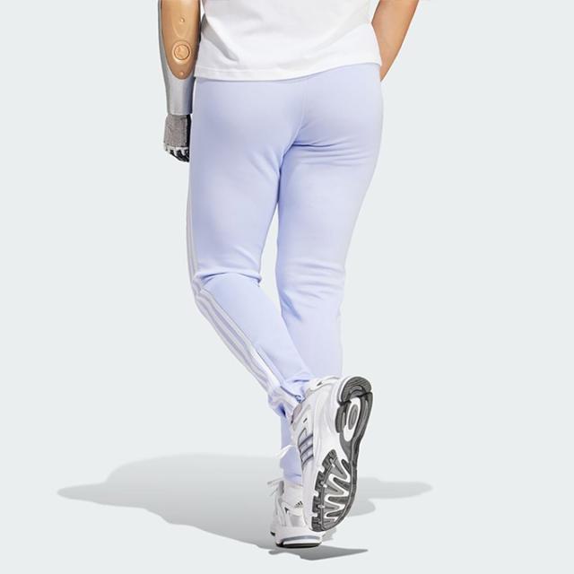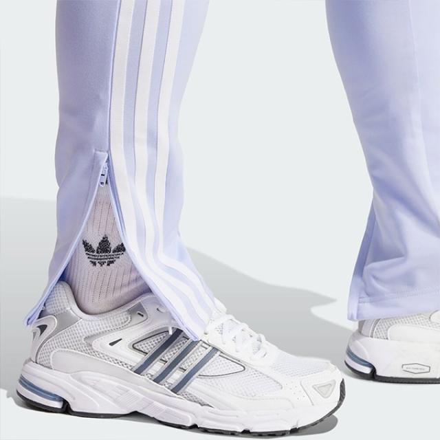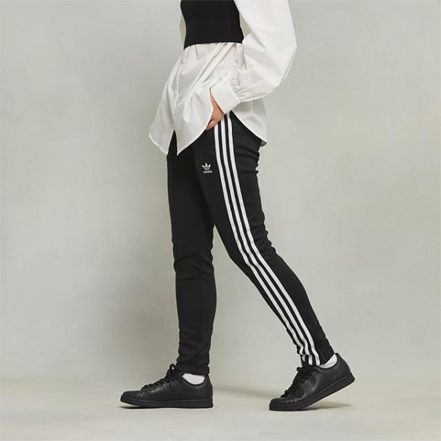 ウエストから裾まで伸びるスリーストライプスが、スポーツウェアの伝統を物語る。
