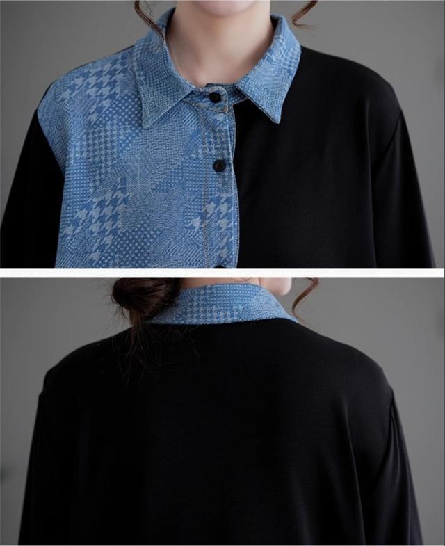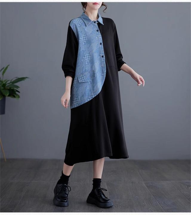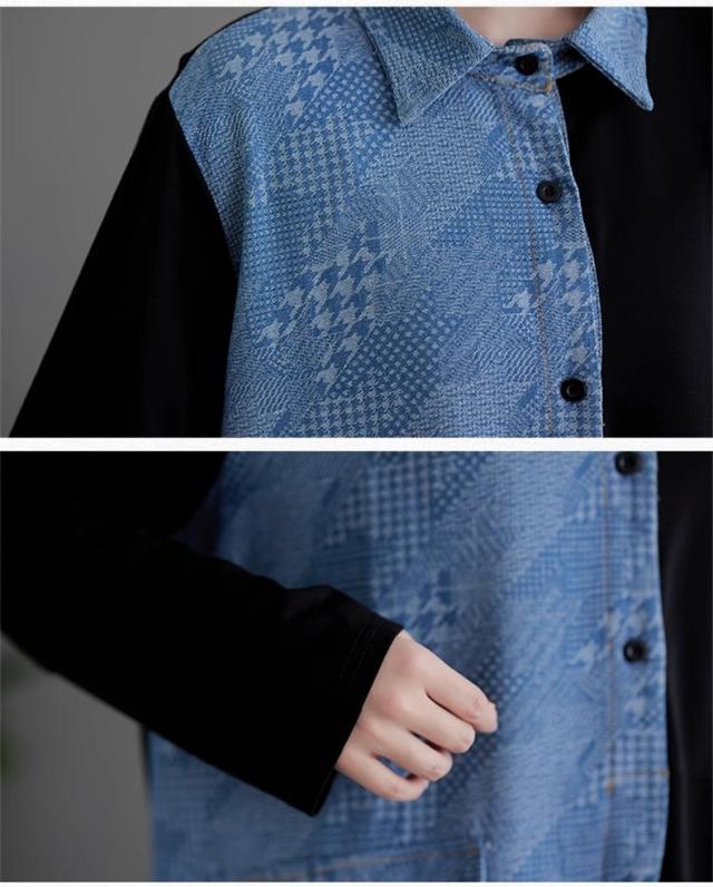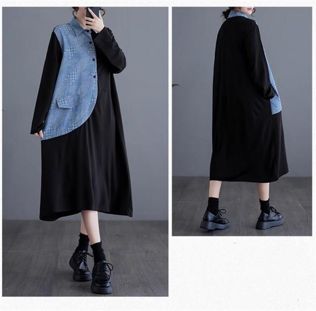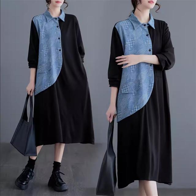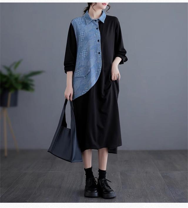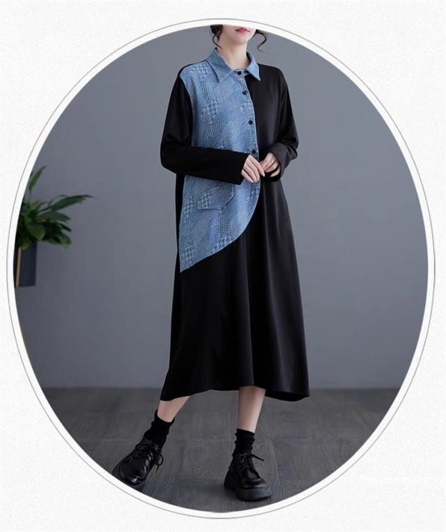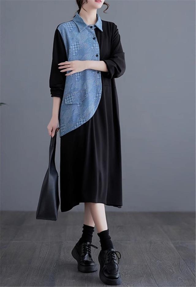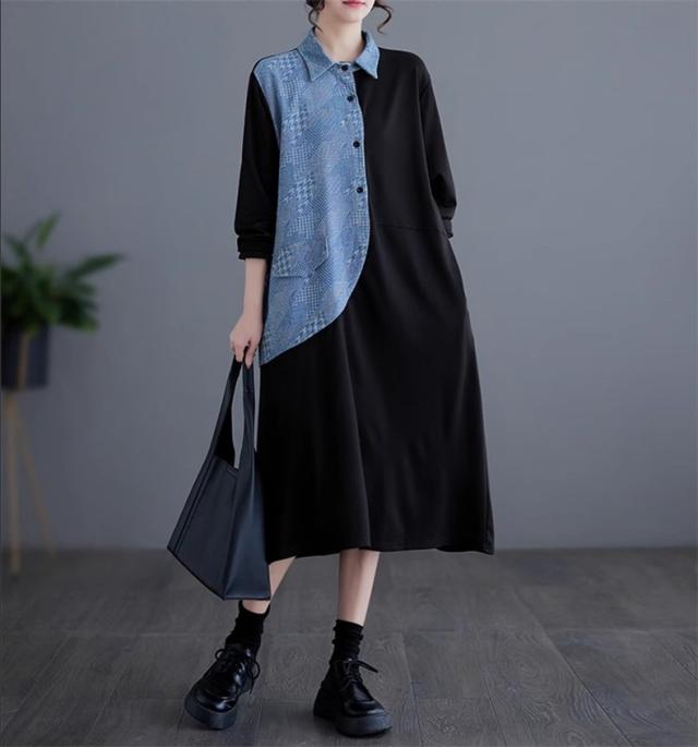 春ワンピース レディース 長袖 シャツワンピース レギュラーカラー レトロ 異素材 切り替え デニムワンピース 体の線を拾い過ぎない 春らしさを先取り