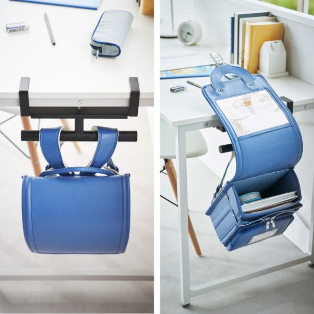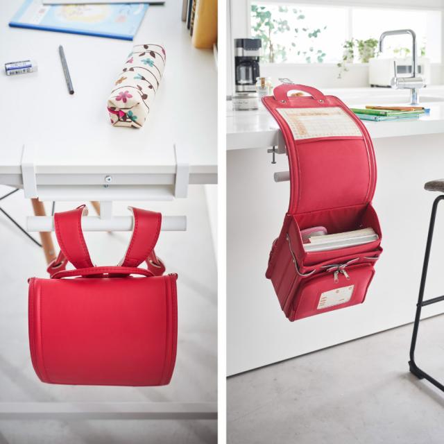デスク横に取り付けてランドセルを収納しても。ランドセルを掛けたまま勉強道具を取り出すこともできます。